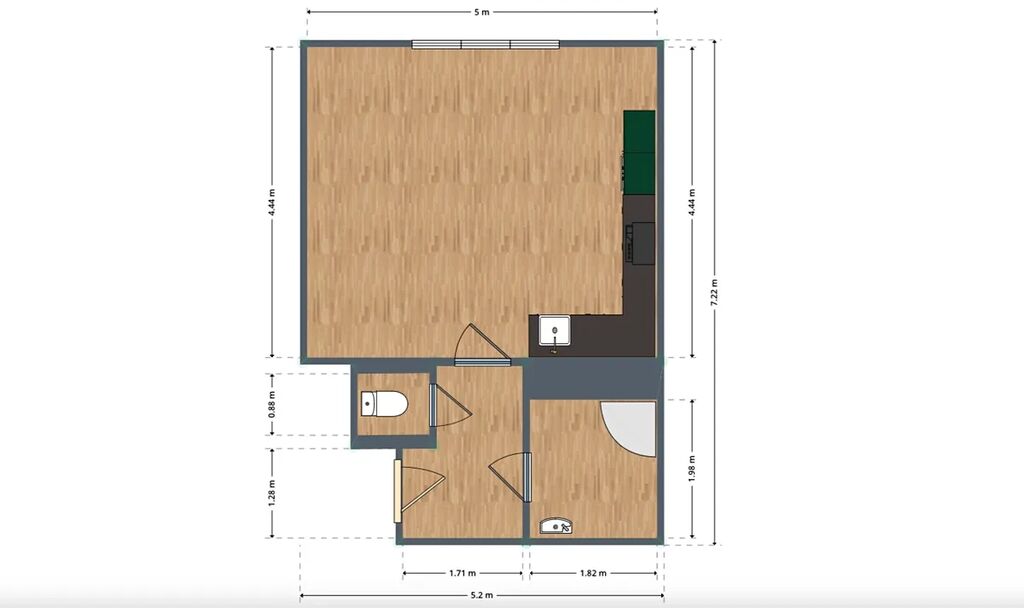 Dispozice: 1+kk (jedna místnost s kuchyňským koutem)