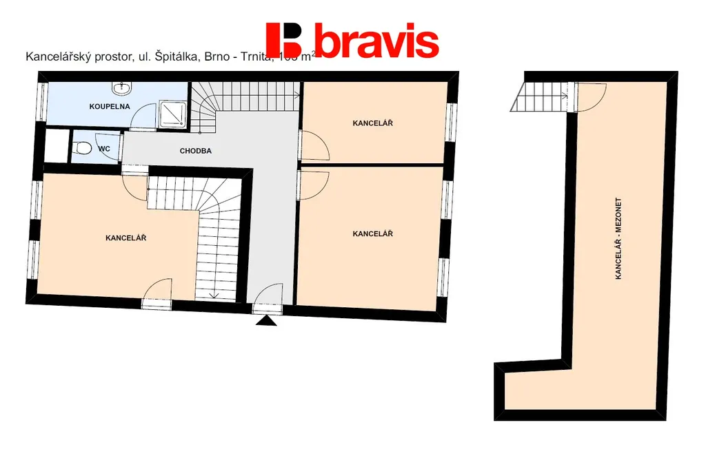 Celé prostory jsou ve spodním patře rozděleny na několika místností a v horním mezonetovém patře je jedna kancelář, kterou lze využít jako služební byt pro přespání.