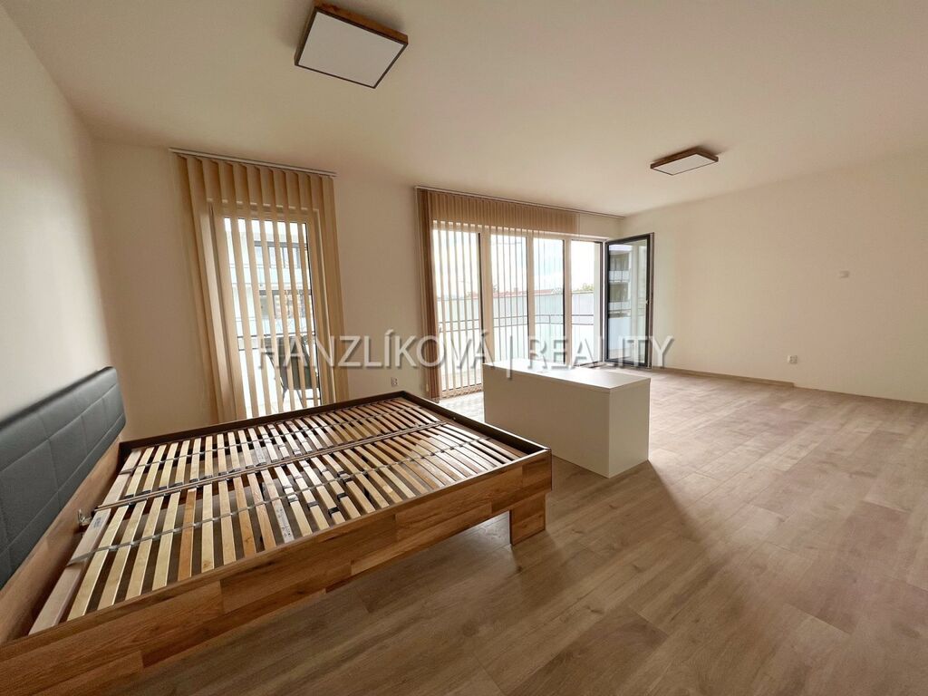 Exkluzivně nabízíme k pronájmu zcela novou bytovou jednotku o dispozici 1+kk, která se nachází ve třetím patře novostavby bytového domu v ulici Oskara Nedbala v Českých Budějovicích. Prostorný byt o výměře 50,7 m2 + terasa 12,6 m2 je orientovaný do vnitrobloku na východ a skládá se z těchto místností : prostorná chodba, kde jsou vestavné skříně, botník a věšák, koupelna se sprchovým koutem, WC, umyvadlo a koupelnový nábytek, hlavní obytná místnost, kde je kuchyňská linka včetně spotřebičů, dvoupostel včetně matrací, křeslo, komoda. Z hlavní místnosti je vstup na terasu o výměře 12.6 m2, kde je posezení ( stůl a dvě křesla). K bytu náleží vyhrazené garážové stání umístěné v suterénu domu. Inteligentní zařízení Loxone ovládá zónovou regulaci topení, zprostředkuje přehled aktuální spotřeby energií, má přístupový systém videovrátného a kódové klávesnice pro pohyb po budově ( ovládací tablet je umístěný v obývacím pokoji). Bytový dům se nachází na rohu ulic Oskara Nedbala a Václava Talicha v širším centru města s výbornou dostupností a veškerou občanskou vybaveností v těsné blízkosti. V docházkové vzdálenosti se nachází nový relaxační park.