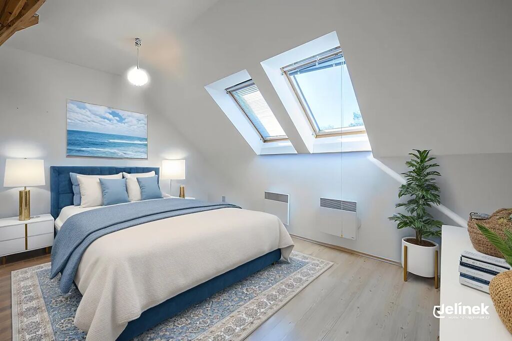 - v podkroví jsou umístěny dva samostatné pokoje, které nabízejí ideální prostor pro dětské pokoje, pracovny nebo oddělenou zónu pro hosty