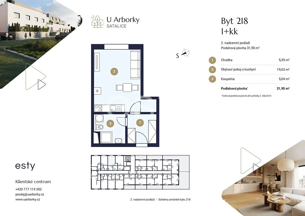 Tento byt se nachází ve 2. nadzemním podlaží a nabízí dispozici 1+kk s celkovou plochou 31,9 m²:
