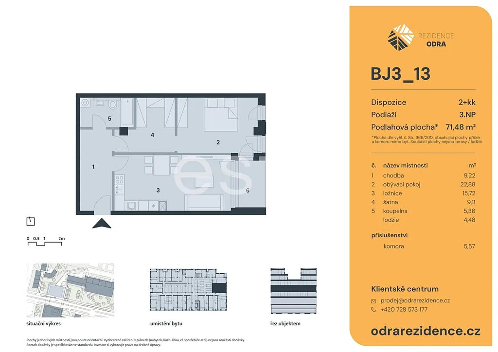 Hledáte nový domov v klidné a přitom skvěle dostupné lokalitě? Rezidence Odra je moderní projekt s duší i budoucností, který vzniká na místě bývalého obchodního centra v pražských Bohnicích. Nyní vám nabízíme konkrétní volnou jednotku 2+kk o ploše 71,48 m², nacházející se ve 3. nadzemním podlaží budovy ve fázi dokončení.