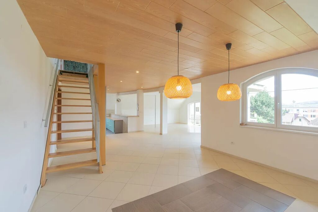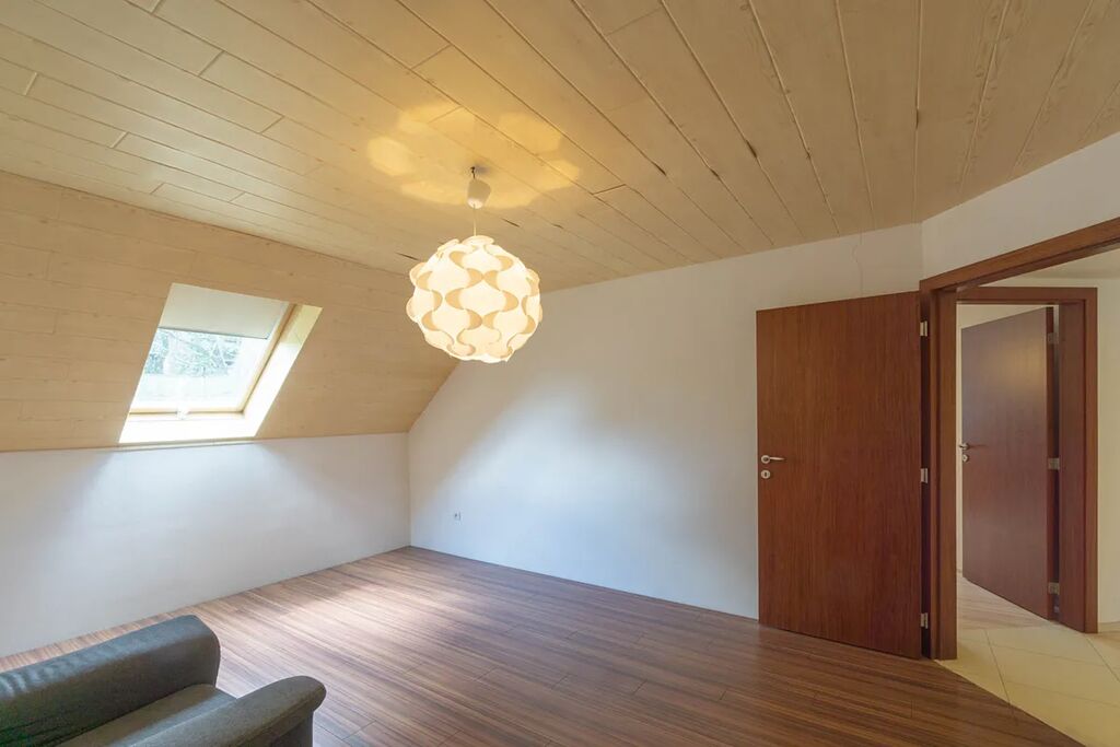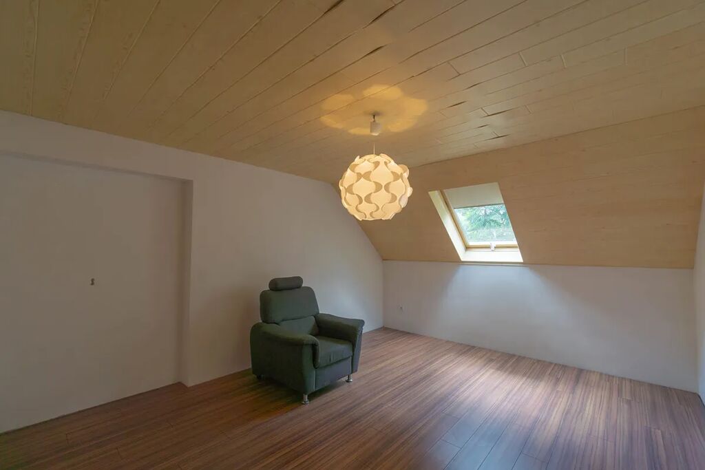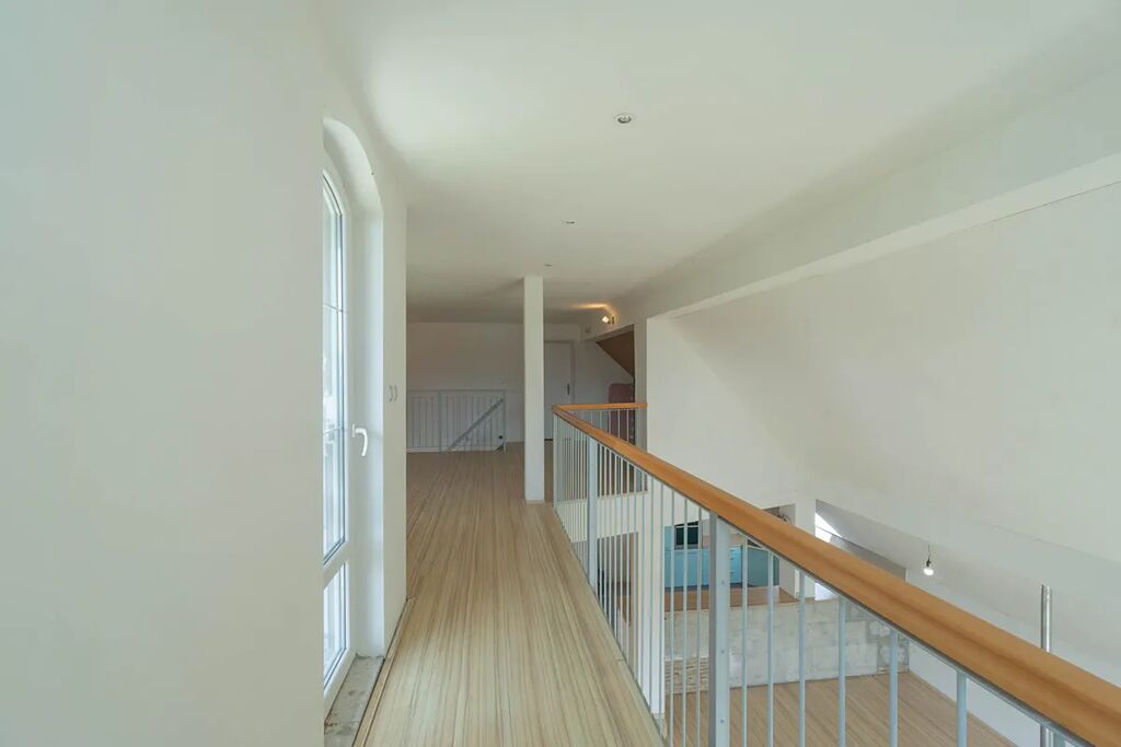 nadzemním podlaží je vstupní hala (13,6 m2) a hlavní obytný prostor - nalezneme tu velkorysý prostor tvořený obývacím pokojem (44,2 m2), na něj navazující jídelnou (33,3 m2) a kuchyní (12,1 m2), která je oddělena barovým pultem. Celý prostor je velmi vzdušný a otevřený směrem na jihovýchod do zahrady, dojem životního prostoru umocňuje vysoký strop zasahující až ke galerii ve druhém nadzemním podlaží. Prostory ještě doplňuje prostorný balkon (10,2 m2). Vyjma hlavní obývají části v nižším patře nalezneme ještě koupelnu s vanou (10,8 m2), samostatné WC (1,9 m2) a tři útulné pokoje/ ložnice (17,4 + 15,6 + 10,4 m2). Prostory ve vyšším patře tvoří galerie (33,6 m2), balkon (5,2 m2) a původní technická část/ půda (45,2 m2), která může být přetvořena na další obytné prostory.