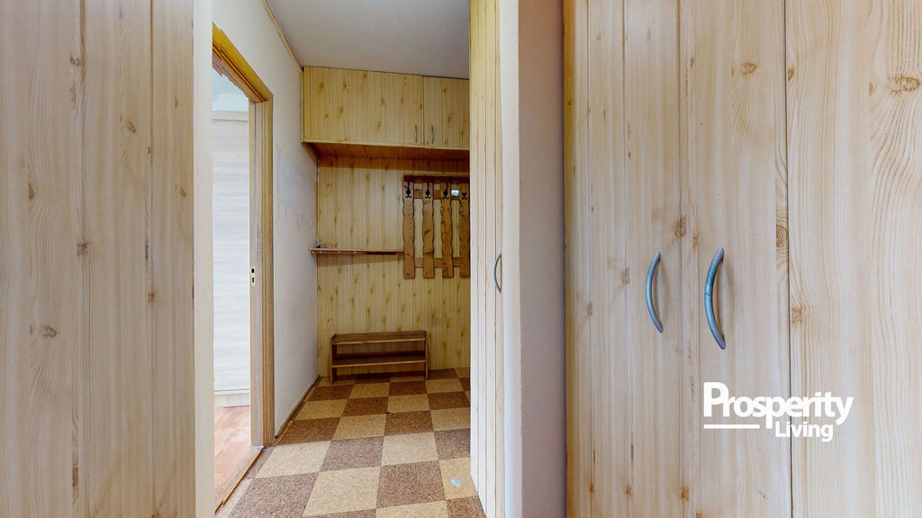 Dispoziční řešení bytu nabízí vstupní chodbu, prostorný obývací pokoj s kuchyňským koutem, ložnici a koupelnu s toaletou. Nabízený byt je v původním stavu, má umakartové bytové jádro, plastová okna se žaluziemi. Podlahovou krytinu tvoří plovoucí podlaha v kombinaci s keramickým obkladem. Velmi nízké měsíční náklady, lze získat na prohlídce. K bytu náleží sklepní kóje.