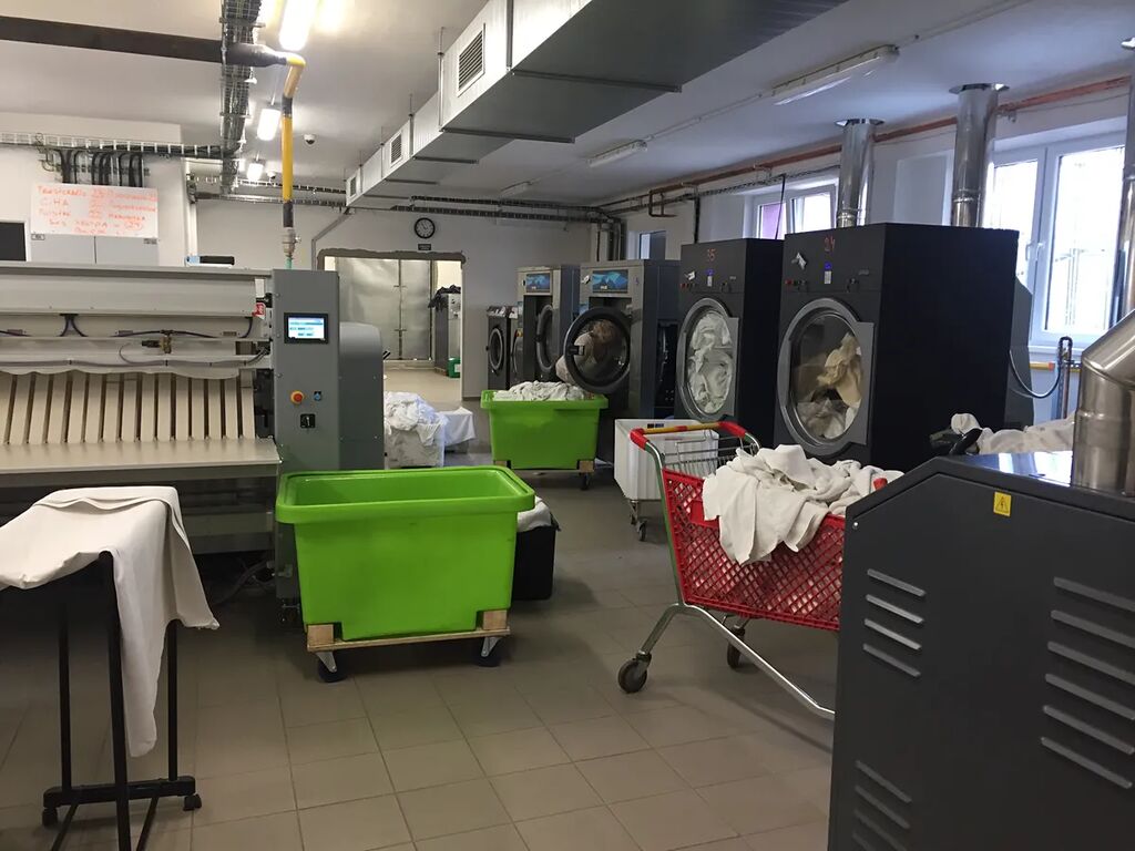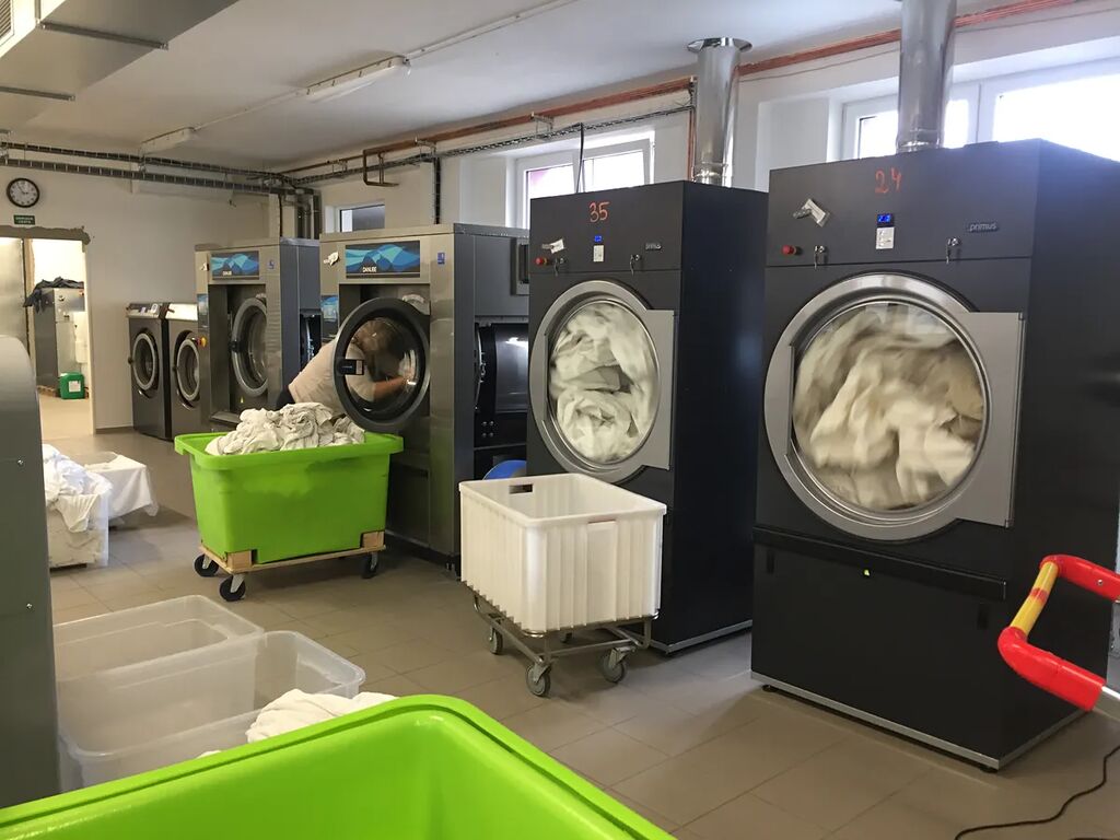 Přízemí slouží k provozu. Zde se nachází místnost na třídění prádla, šatny se sprchami a hygienické zázemí pro personál, automatizovaný sklad na prací prostředky, hlavní sála na praní, sušení a žehlení prádla, sklad na čisté prádlo připravené k expedici, sklad na pojízdné klece na prádlo a velká místnost připravená na zavedení oddělení chemického čištění.