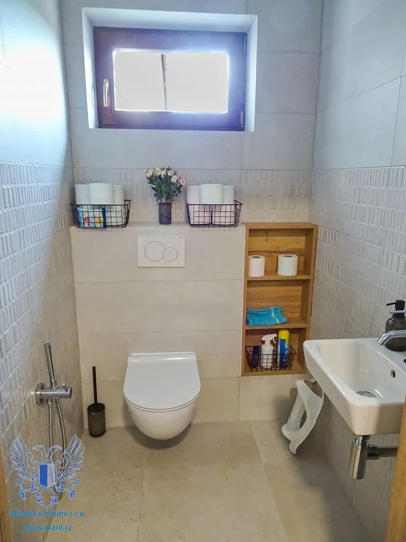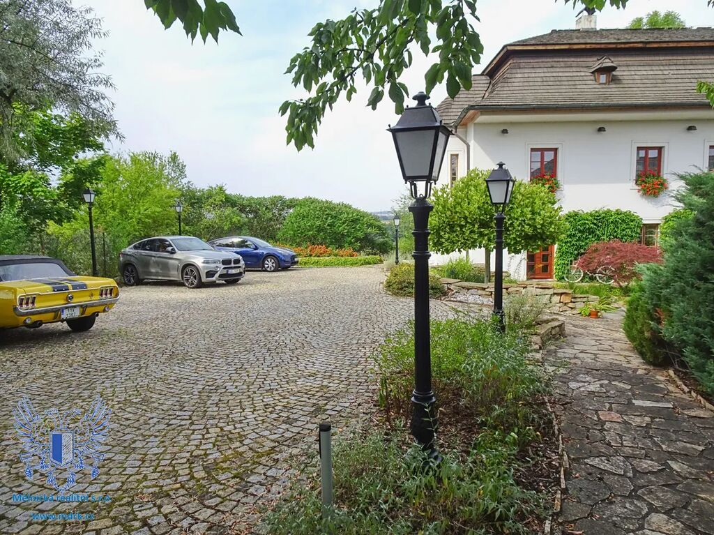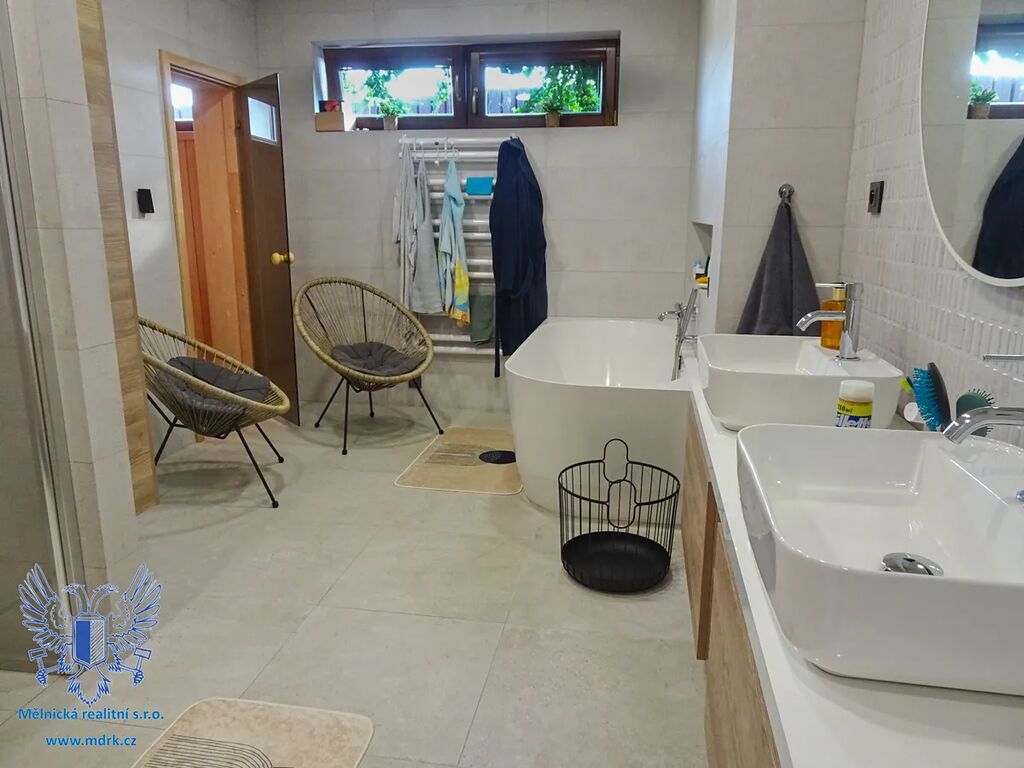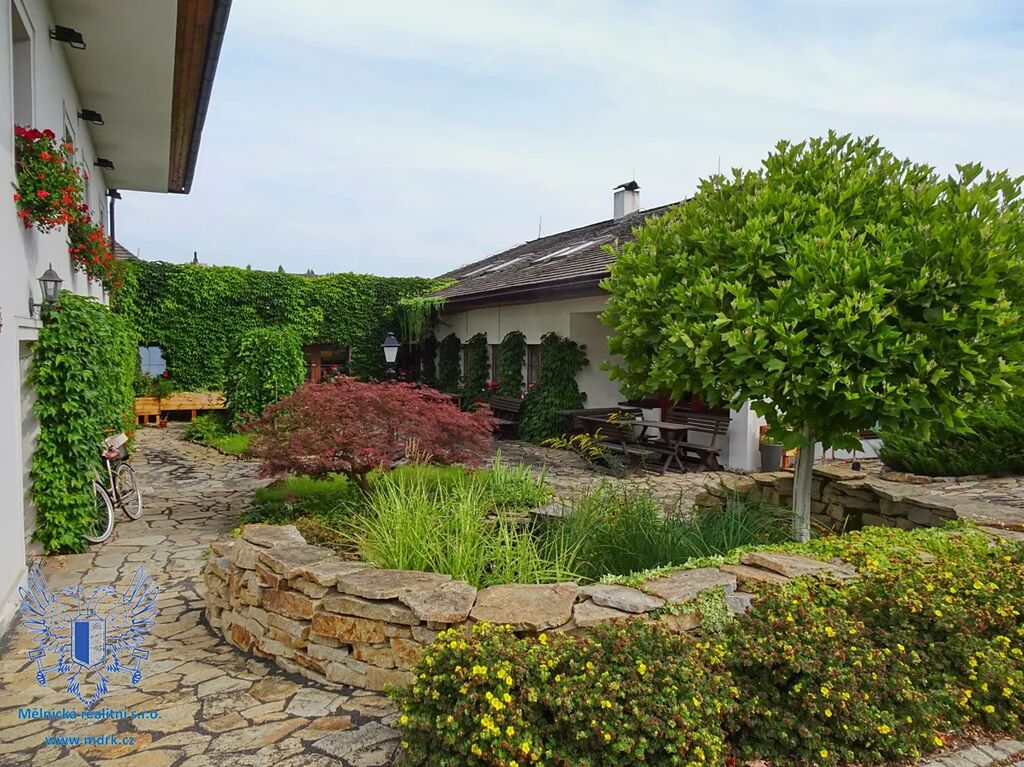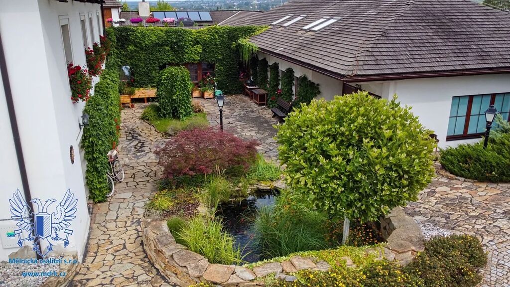 U domu najdeme vkusnou okrasnou zahradu s jezírkem a terasou, parkoviště pro 6 aut (+možnost parkování před garáží) a také zatravněné plochy nad vinicí s výhledem na řeku Labe.