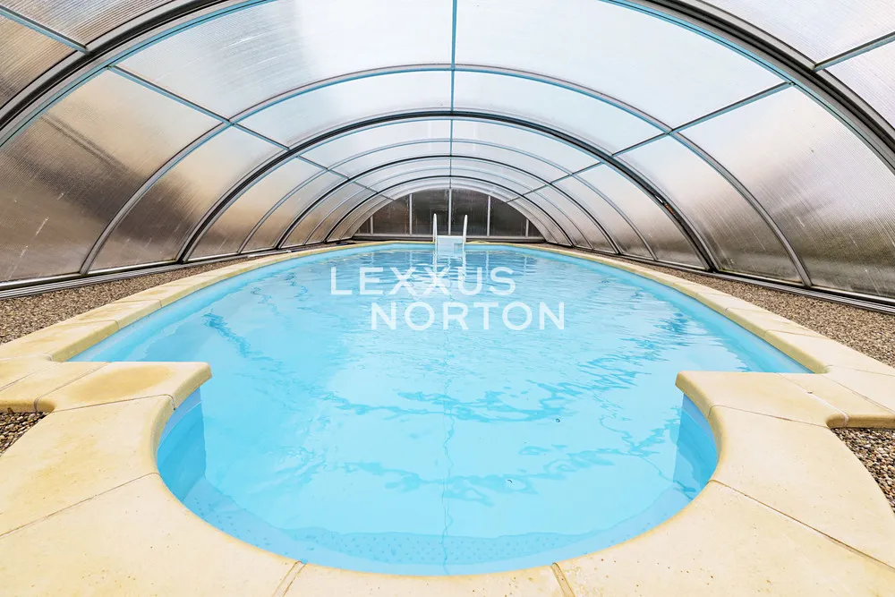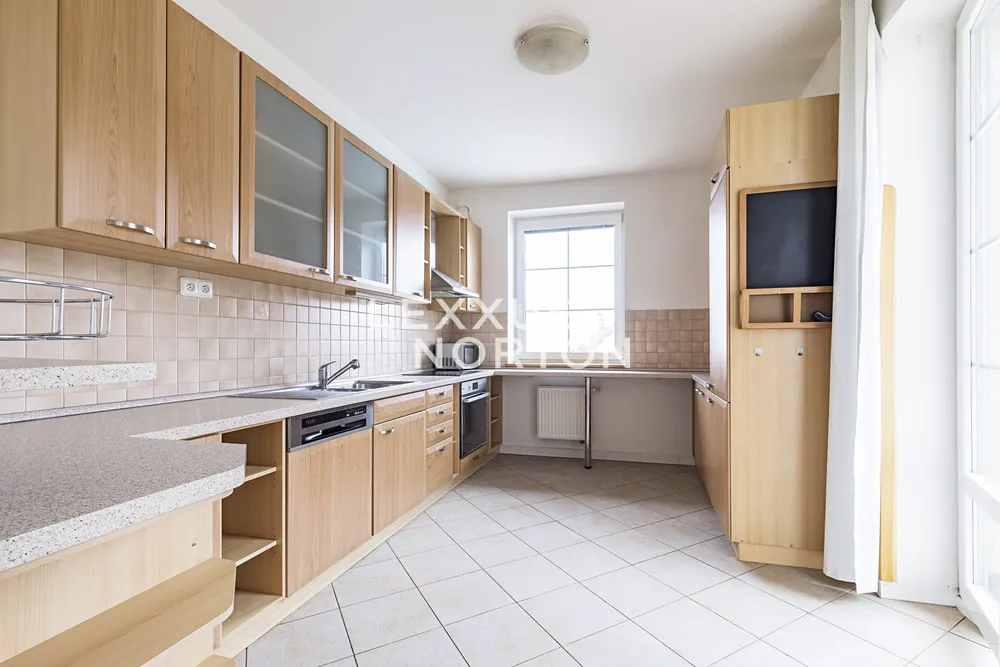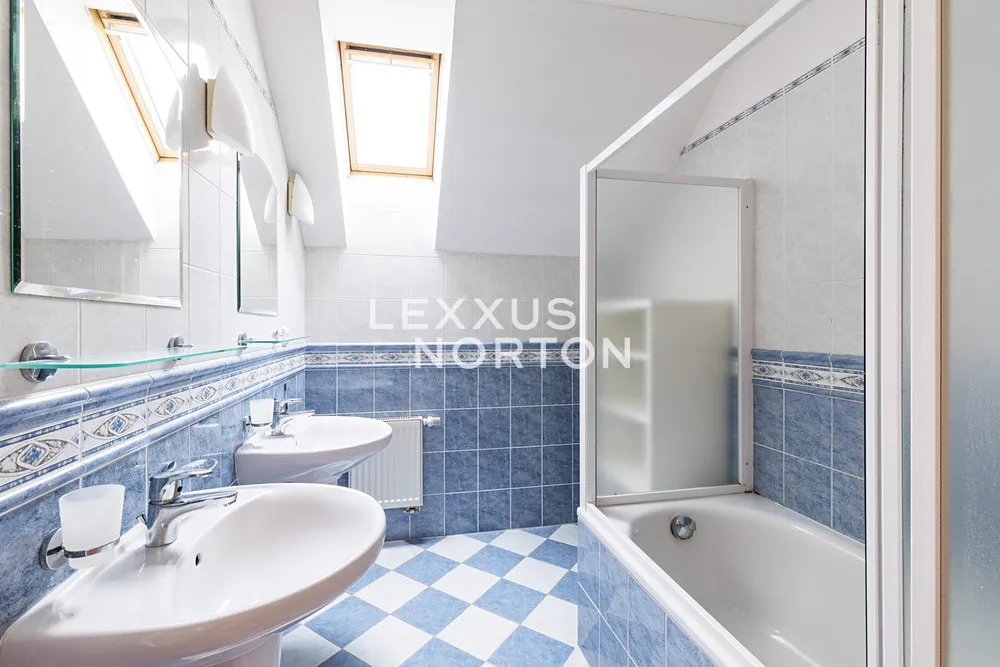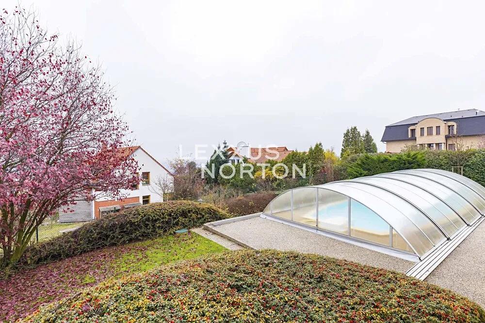 V přízemí domu se nachází vstupní hala, prostorný obývací pokoj se vstupem na terasu (36 m2) a zahradu, samostatná plně vybavená kuchyň (sklokeramická deska, lednice, mrazák, trouba, mikrovlnná trouba a myčka nádobí) včetně jídelního prostoru, pracovna, technické zázemí a garáž pro 2 vozidla. Horní patro dispozičně nabízí 4 ložnice, z nichž dvě mají přístup na vlastní balkon, šatnu a 2 koupelny disponující vanou či sprchovým koutem. V suterénu je prádelna, kotelna, herna / fitness a vstup do garáže. Součástí vybavení nemovitosti je alarm s možností napojení na bezpečnostní agenturu, vestavěné skříně, půdní úložný prostor, satelitní TV připojení. K nemovitosti náleží vyhřívaný krytý bazén, nádherně udržovaná zahrada a garáž pro 2 vozidla.