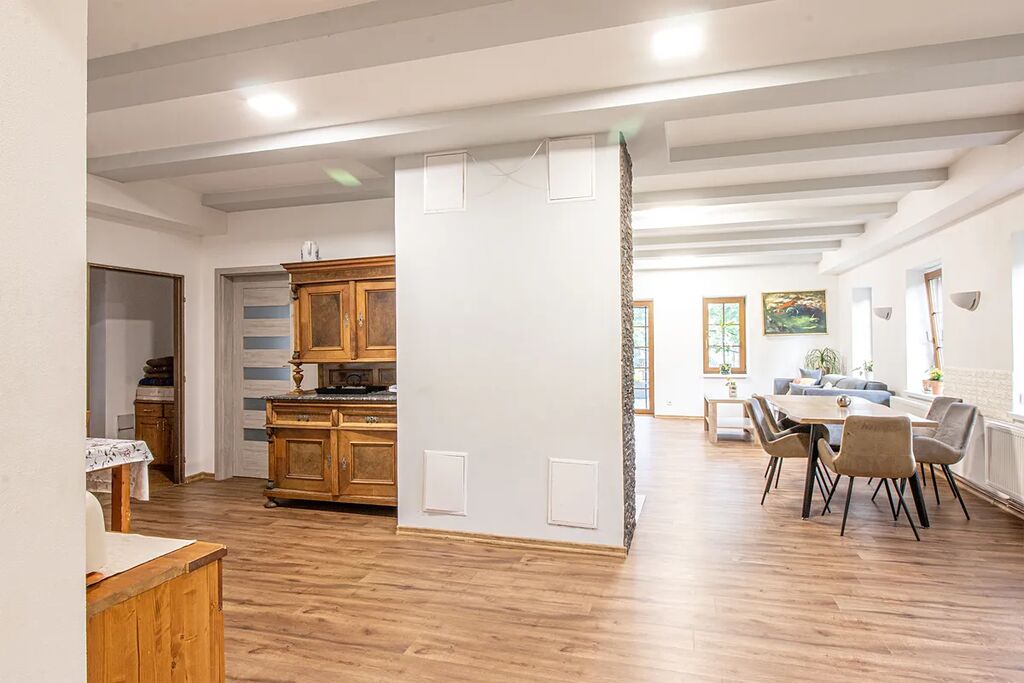 Nabízíme k prodeji nádherný a prostorný rodinný dům v Petrovicích, který prošel kompletní rekonstrukcí. Tento cihlový dům o třech nadzemních podlažích nabízí celkem 10 místností, včetně dvou velkých moderních bytů a čtyř pokojů, každý s vlastní koupelnou. Díky této dispozici je ideální nejen pro rodinné bydlení, ale také pro podnikání jako penzion či jiné ubytovací zařízení. Dům se nachází v klidné části obklopené přírodou s krásným výhledem na Lužické hory z prostorné terasy. Je situován poblíž německých hranic, nedaleko města Žitava a blízko měst Jablonné v Podještědí a Liberec. Tento luxusní dům je ideálním řešením pro ty, kteří hledají klidné bydlení v přírodě s dobrou dostupností městských center. Celková plocha pozemku činí 378 m². Nezmeškejte tuto jedinečnou příležitost!