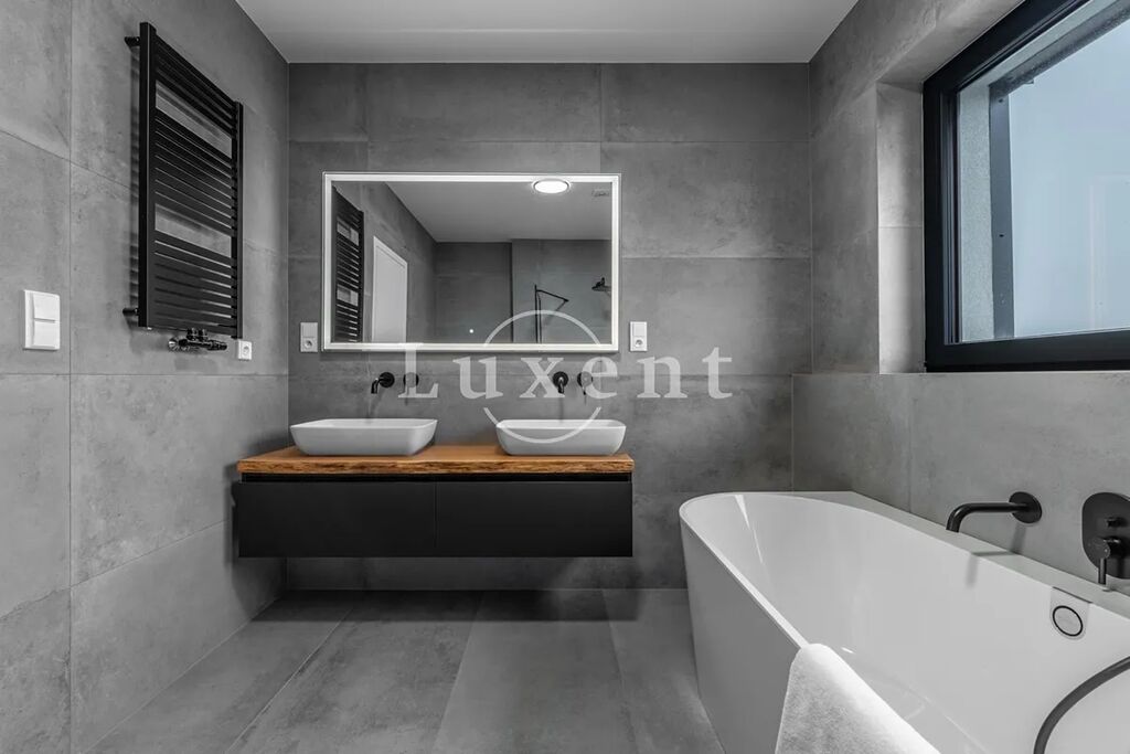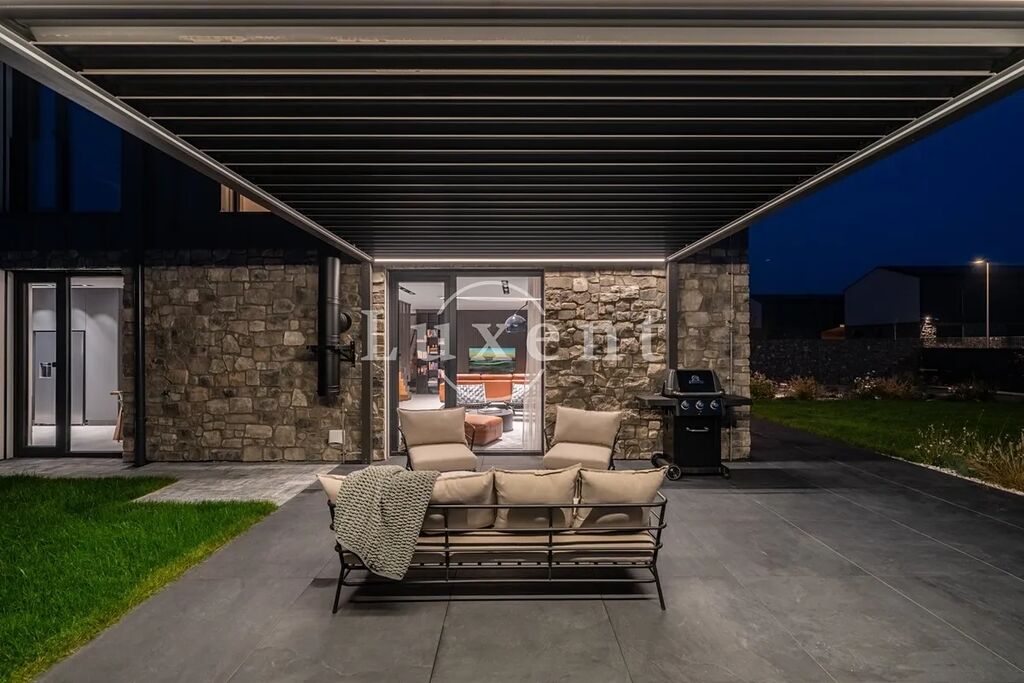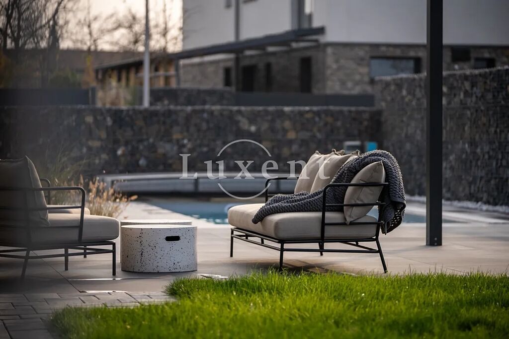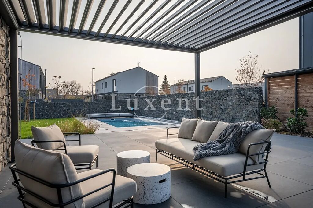 U domu je zastřešené stání pro dva vozy a další parkování pro tři vozy na pozemku. Zahrada je kompletně zrealizovaná, položený travní koberec, zasazené stromy a keře. U domu je bazén Desjoyaux 7x3 m s nejvyšší řadou zastřešení Alukov. Dům má kamenný obklad fasády v kombinaci 2.NP s oplechováním. Plášť tvoří cihlové bloky Porotherm (44 Profi), příčky cihlové Porotherm Wienerberger. Střecha Ruukki Classic – špičková ocelová střecha, jejíž profil připomíná tradiční falcované krytiny. Okna na čele domu v obou patrech jsou hliníková (HS portál), ostatní okna trojskla, kvalitní plastová v antracitu v tónu střechy a na všech oknech jsou předokenní hliníkové žaluzie ovládané LOXONE. Interiérové designové dveře s kouřovým sklem JAP a bezfalcové dveře od firmy Prüm, vstupní dveře hliníkové prosklené, antracit, trojsklo. Vytápění a chlazení domu tepelným čerpadlem Vaillant (země – voda) s integrovaným zásobníkem teplé užitkové vody. Podlahové topení a chlazení Rehau. V domě je příprava na FVE. Energetická třída domu je B – velmi úsporná. Na zahradě je retenční nádrž na dešťovou vodu.