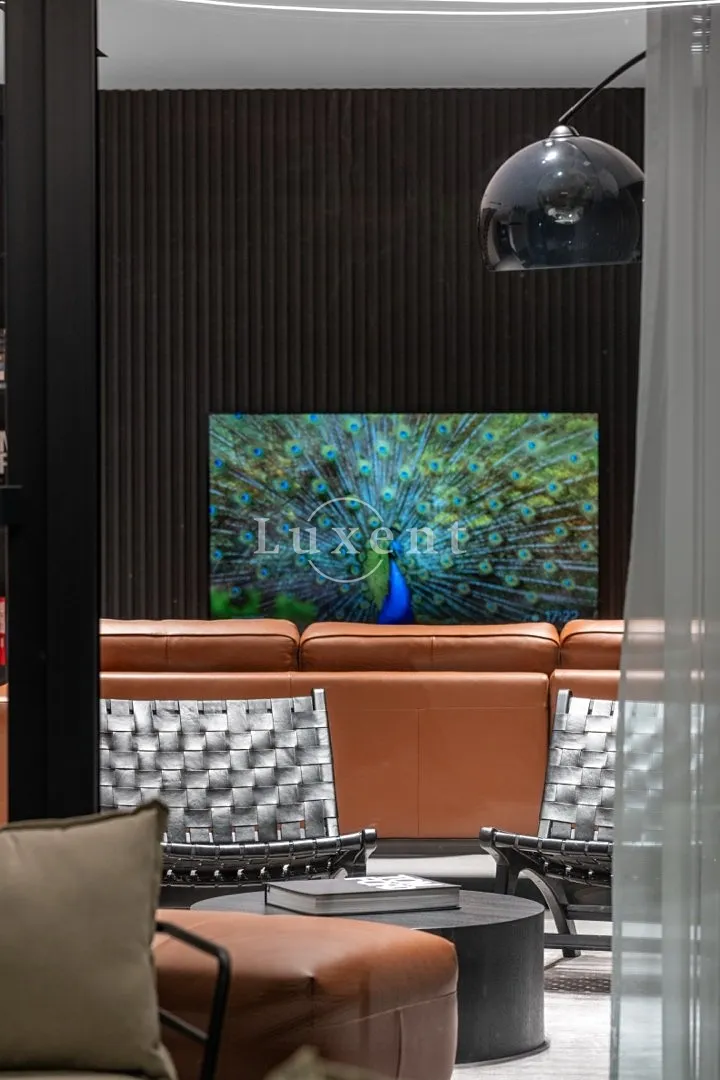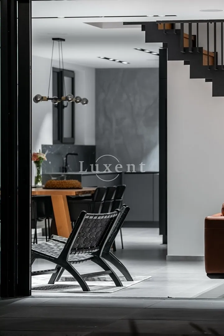 V 1.NP je prostorná předsíň s vestavěnými šatními skříněmi, pokoj pro hosty (12 m²), koupelna se sprchovým koutem a toaletou, technická místnost a elegantní minimalistická kuchyň s jídelním koutem (27 m²), na kterou navazuje prosvětlený obývací pokoj s krbem ( 38,5 m²). Z obývacího pokoje je přístup na terasu, která má na západní části instalovanou bioklimatickou pergolu s LED osvětlením. Celé 1.NP má italskou velkoformátovou dlažbu 90x90cm.