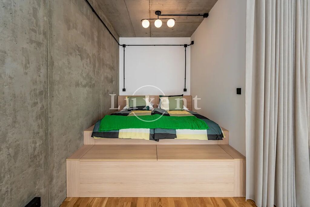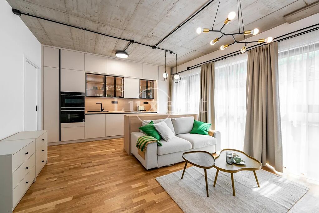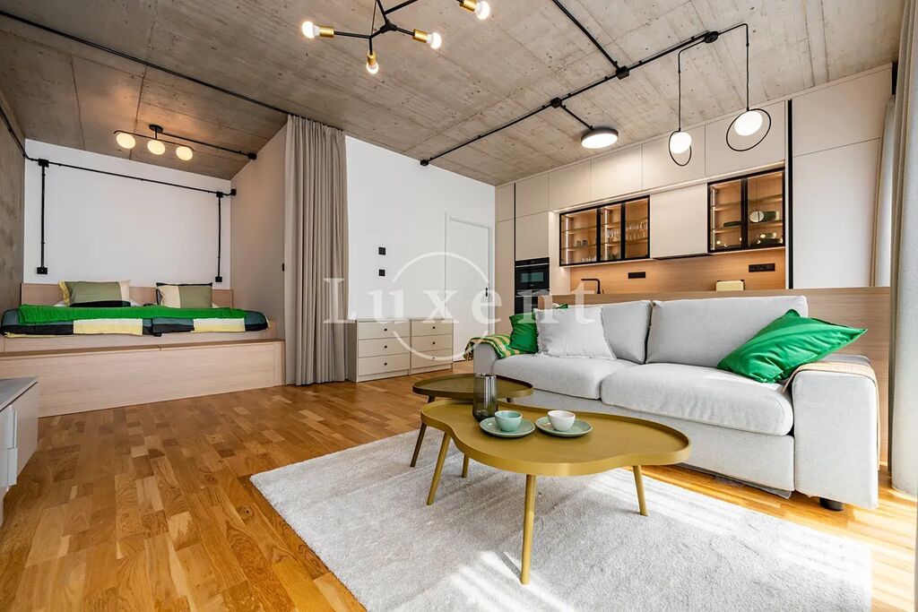Originálně řešená dispozice designového bytu tvoří vstupní předsíň, vzdušný obývací pokoj s kuchyňským koutem a barovým pultem, který odděluje kuchyň od obývacího pokoje. Součástí obývacího pokoje je i nápaditě začleněný prostor na spaní s úložným místem. Dále prostorná koupelna se sprchovým koutem walk-in, umyvadlem a toaletou. Kuchyň je vybavená veškerými moderními spotřebiči Siemens, pračkou, ale také nádobím.