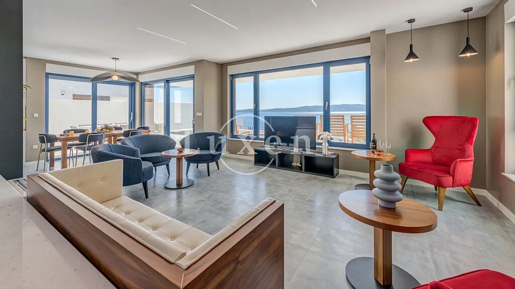 Vila o celkové užitné ploše 400 m2 se rozkládá na čtyřech úrovních. V přízemí se nachází ložnice s vlastní koupelnou, kuchyň propojená s jídelnou a prostorný obývací pokoj s přímým vstupem na terasu – ideální pro ranní kávu či večerní relaxaci s výhledem na moře. V prvním patře jsou umístěny tři komfortní ložnice, každá s vlastní koupelnou a přístupem na balkon, odkud se otevírá nádherný výhled na moře a pobřeží Makarské riviéry.