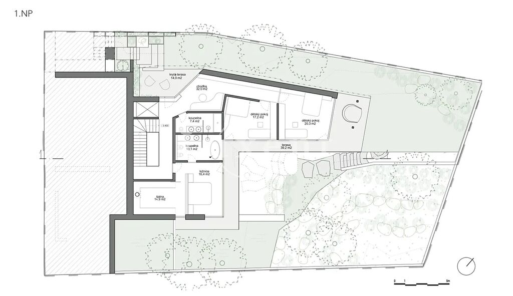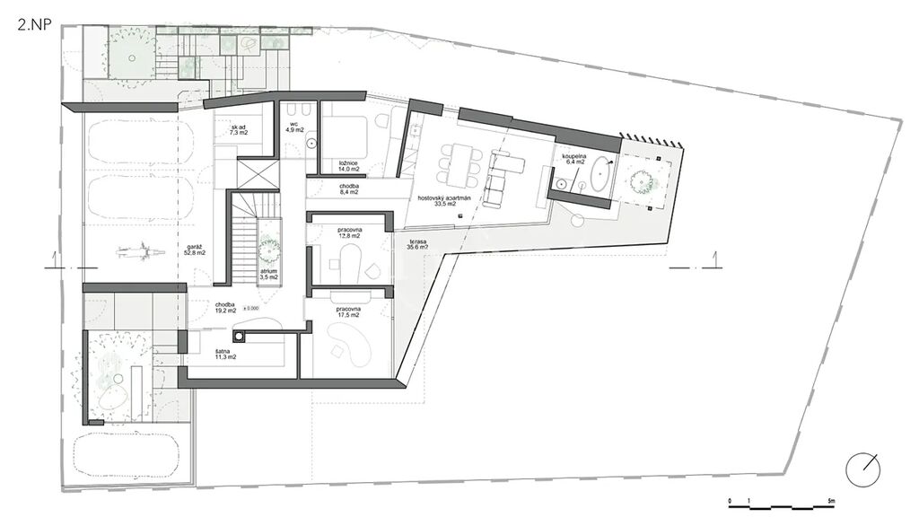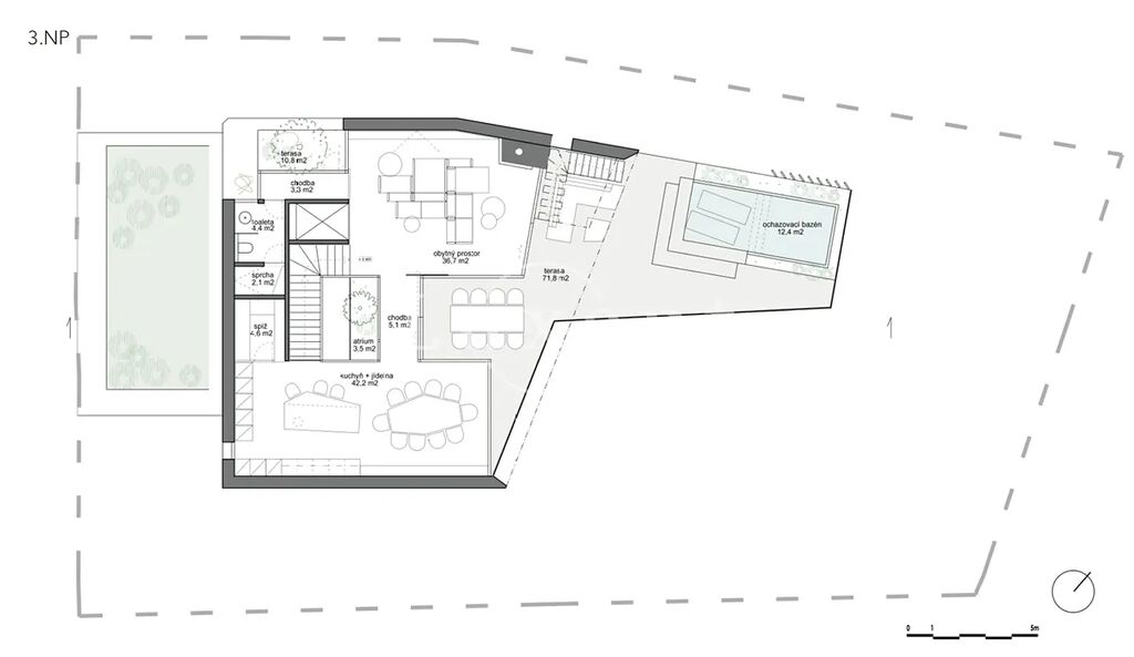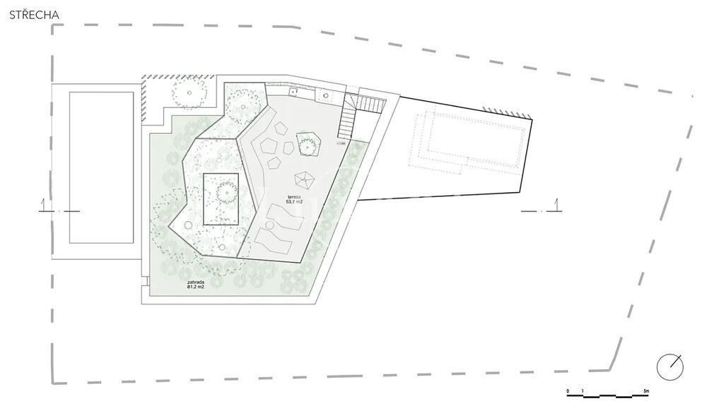 Ve spolupráci s architektonickým studiem de.fakto byla vytvořena studie moderní vily, která vyhovuje současným požadavkům zákazníků. Vila byla navržena s ohledem na polohu pozemku s maximální možností využití (582 m2 obytných ploch), možnosti výhledů (terasy a střešní zahrada 305 m2), zachování soukromí a s důrazem na světlost interiérů.