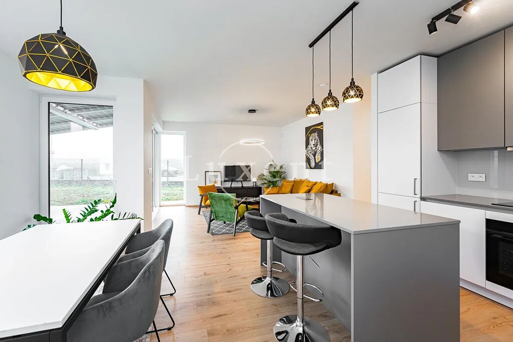 V přízemí domu je předsíň, koupelna, prádelna, tech. místnost a pak obývací pokoj příjemně prosklený do zahrady a na terasu. Je zde též integrovaná garáž s přípravou pro dobíjecí stanici. V patře je pak hlavní ložnice s vlastní koupelnou a šatnou, dva dětské pokoje s druhou koupelnou a úložná komora. Chodba nad schodištěm je prosvětlena světlíkem s přípravou pro el. pohon. Více viz přiložené půdorysy. Na podlahách je kvalitní laminátová plovoucí podlaha (dekor dle domu) a keramická dlažba. Vybavení koupelen: Villeroy & Boch.