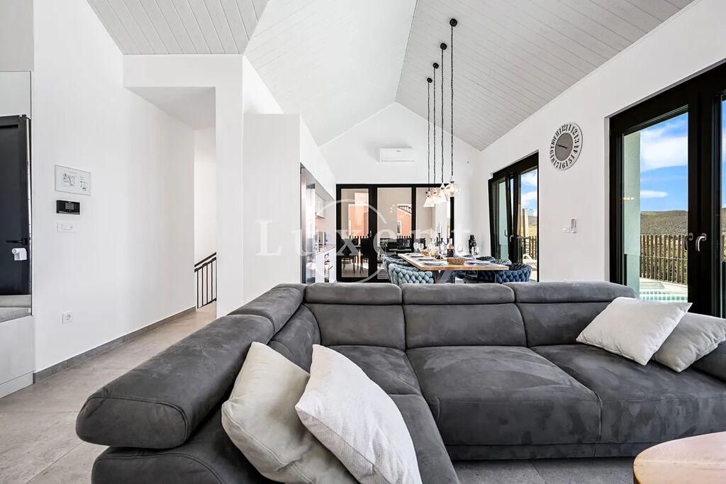 Venkovní část vily tvoří prostorná, oplocená terasa s vyhřívaným bazénem a dechberoucím výhledem na moře. K dispozici je rovněž kryté venkovní posezení s krbem a komfortním nábytkem, ideální pro letní večery.