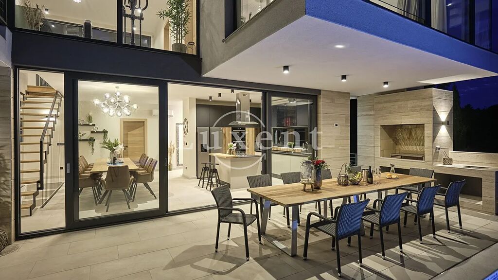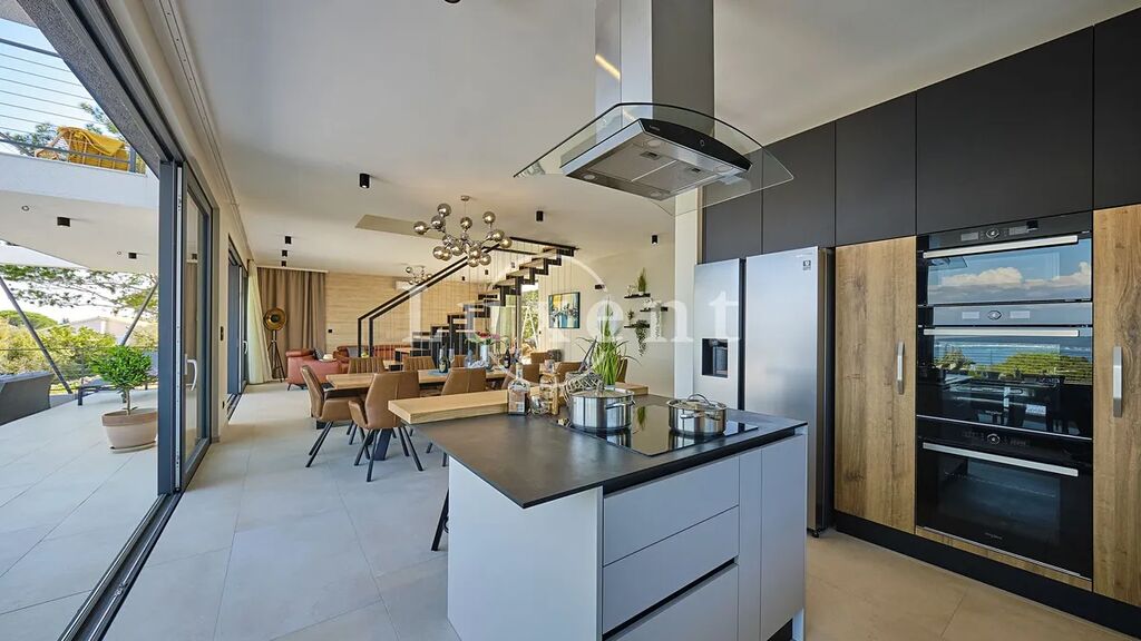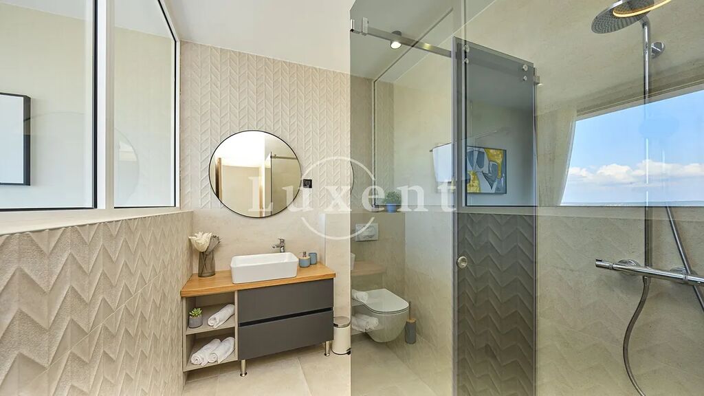 Nabízíme k prodeji nádhernou moderní vilu 400 m2, která se nachází v tichém prostředí s nerušeným výhledem na moře. Tato jedinečná rezidence, postavená na pozemku o rozloze 773 m2, se rozkládá na třech komfortních podlažích a nabízí elegantní kombinaci nadčasového designu, vysoce kvalitního vybavení a absolutního soukromí.