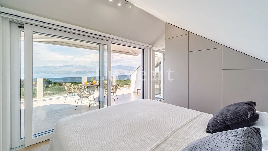 Po vnitřním schodišti se dostaneme do horního patra, kde se nachází hlavní ložnice s en-suite koupelnou a přímým vstupem na soukromou terasu. Z této terasy se otevírá nádherný výhled na moře a okolní krajinu.
