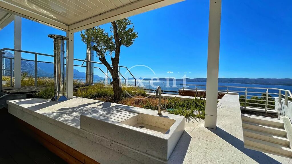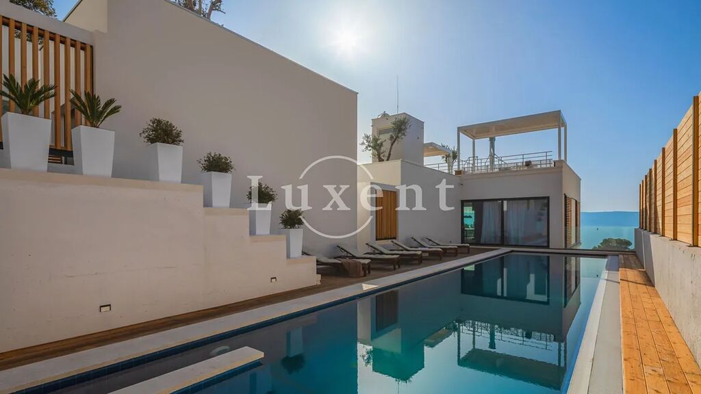 Nabízíme k prodeji atraktivní luxusní vilu s dechberoucím výhledem na moře, která se nachází v klidné oblasti nedaleko vyhledávaného letoviska Omiš. Tato výjimečně navržená vila o celkové obytné ploše 289 m2 se rozprostírá na čtyřech úrovních – přízemí, dvou nadzemních podlažích a střešní terase – a je vybavena řadou prémiových prvků pro maximální komfort a moderní životní styl.
