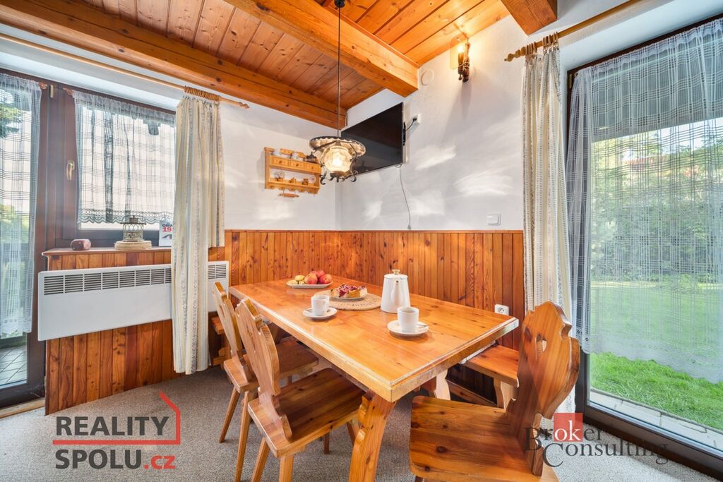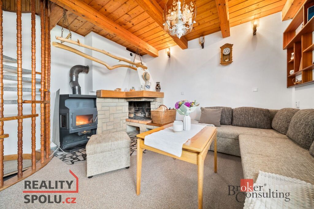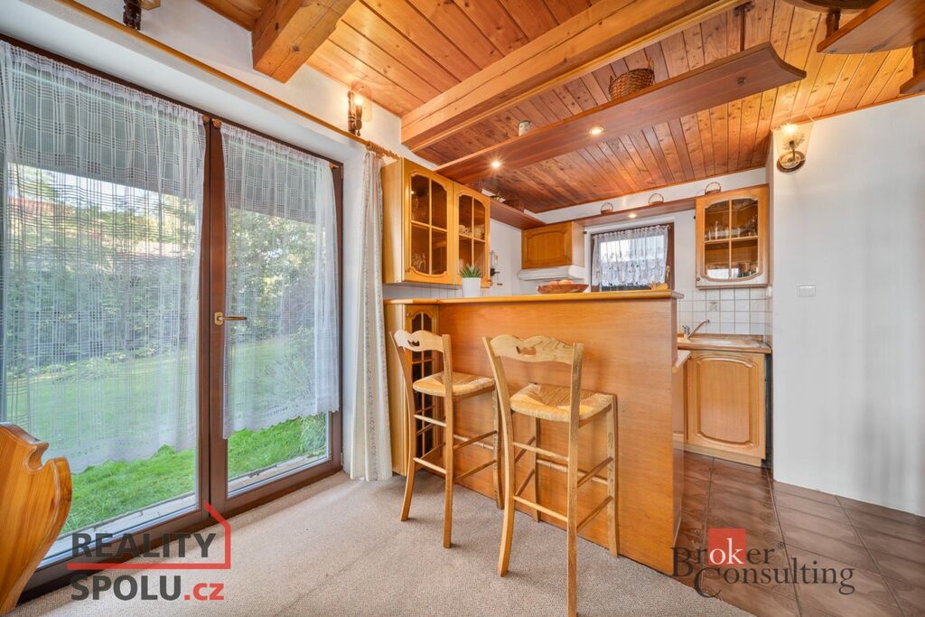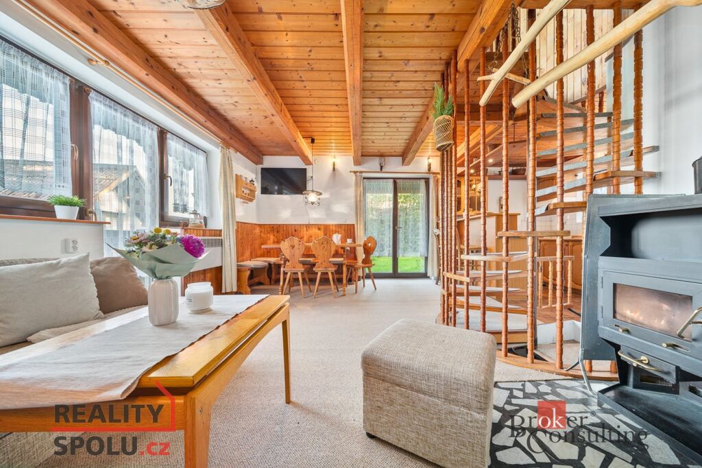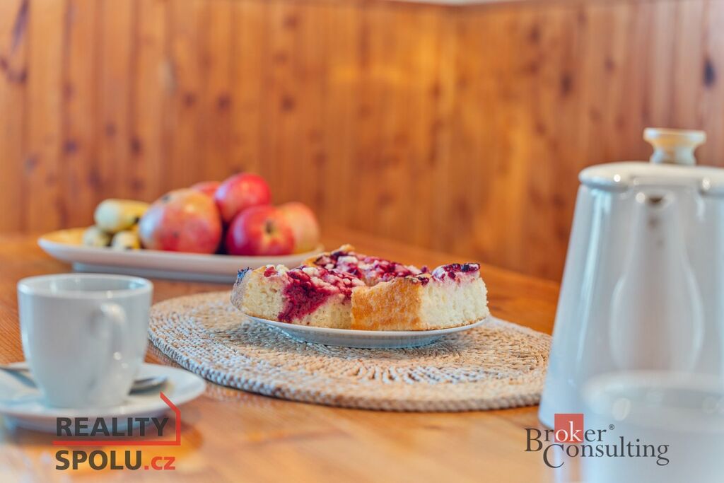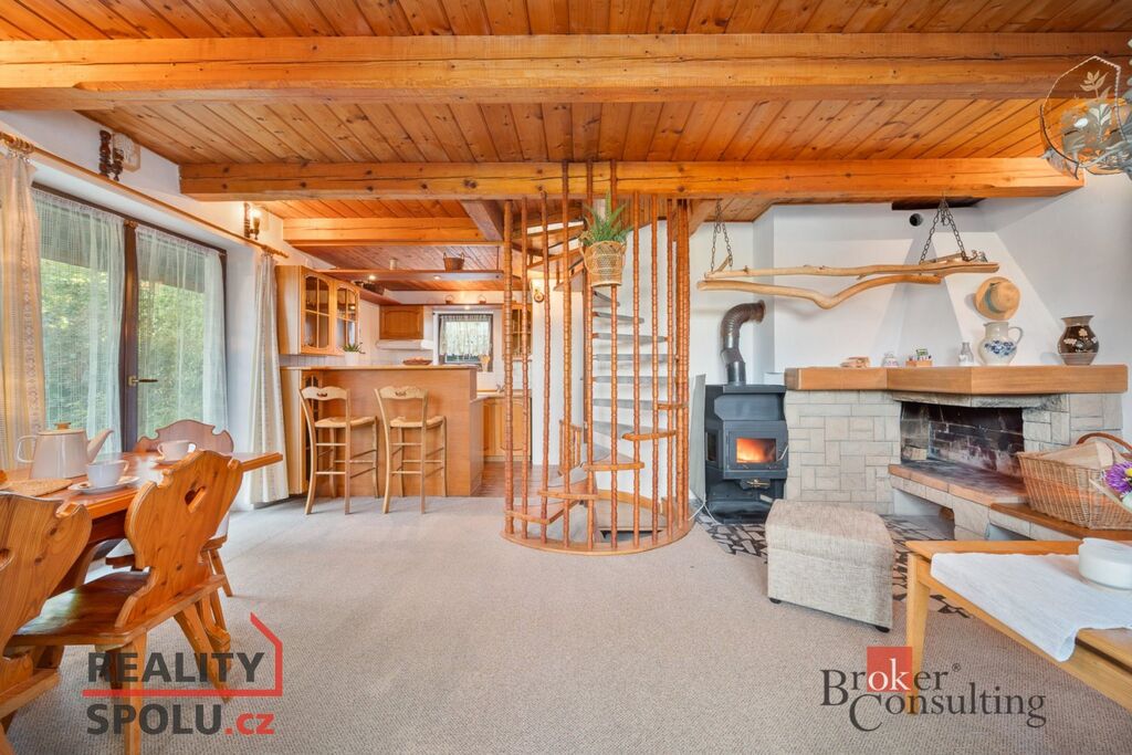 V přízemí se nachází kuchyně spojená s obývacím koutem a jídelním stolem. Z obývacího pokoje je přímý vstup na slunnou terasu, kde si vychutnáte ranní kávu nebo večerní posezení. V podkroví jsou tři útulné pokoje a balkon s nádherným výhledem do okolní přírody.