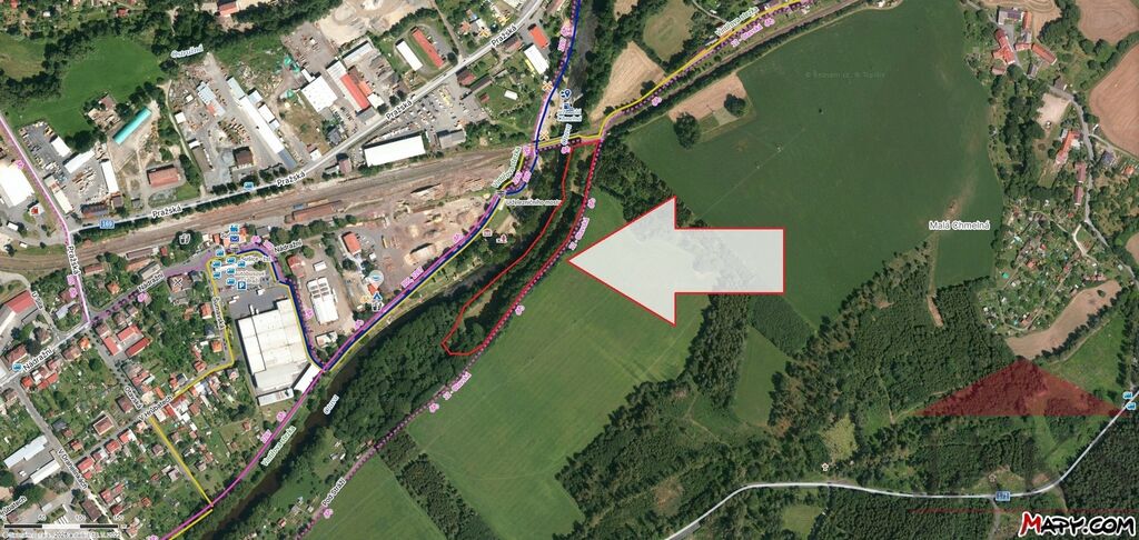 4 – Červená varianta: pozemky o celkové výměře 1.567 m2 (krajní pozemky končící až u železničního mostu, kde se sjíždějí obě větve Otavské cyklostezky č. 12), za cenu 470.100 Kč.
