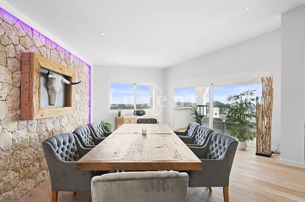 Prostorný a otevřený obývací pokoj s jídelnou je ideální pro společenské akce, a moderní kuchyně je vybavena špičkovými spotřebiči včetně vinotéky, trouby Miele, varné desky Bora s ostrůvkovým řešením, dvou velkých kombinovaných lednic s mrazničkou, myčky na nádobí, kávovaru Miele a šuplíky na ohřev nádobí. Částečně krytá terasa nabízí skvělé místo k odpočinku s nádherným výhledem.