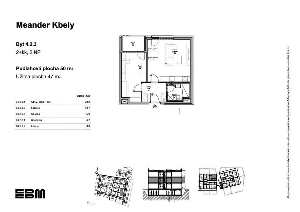 Vstupte do nového domova Meander Kbely, kde se nachází byt 4.2.3 o podlahové ploše 50 m2 – místo, které spojuje moderní architekturu, útulnost a harmonii s přírodou. V projektu se nachází 96 bytů o dispozicích od 1+kk až po prostorné 4+kk.