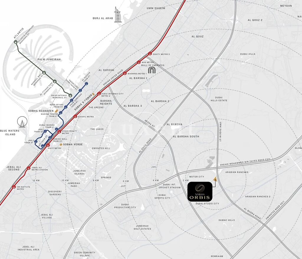 Sobha Orbis je strategicky umístěn jen pár minut od ulic Mohammed bin Zayed a Quadra Road, což obyvatelům umožňuje snadný přístup k hlavním atrakcím Dubaje, jako jsou Dubai Mall nebo Burj Khalifa. Do populární části Downtown Dubai dojedete za 22 minut, do Dubai Mariny za 16 minut a na mezinárodní letiště v Dubaji dorazíte za pouhých 25 minut. V blízkosti rezidence najdete také mezinárodní školu GEMS Metropole School.
