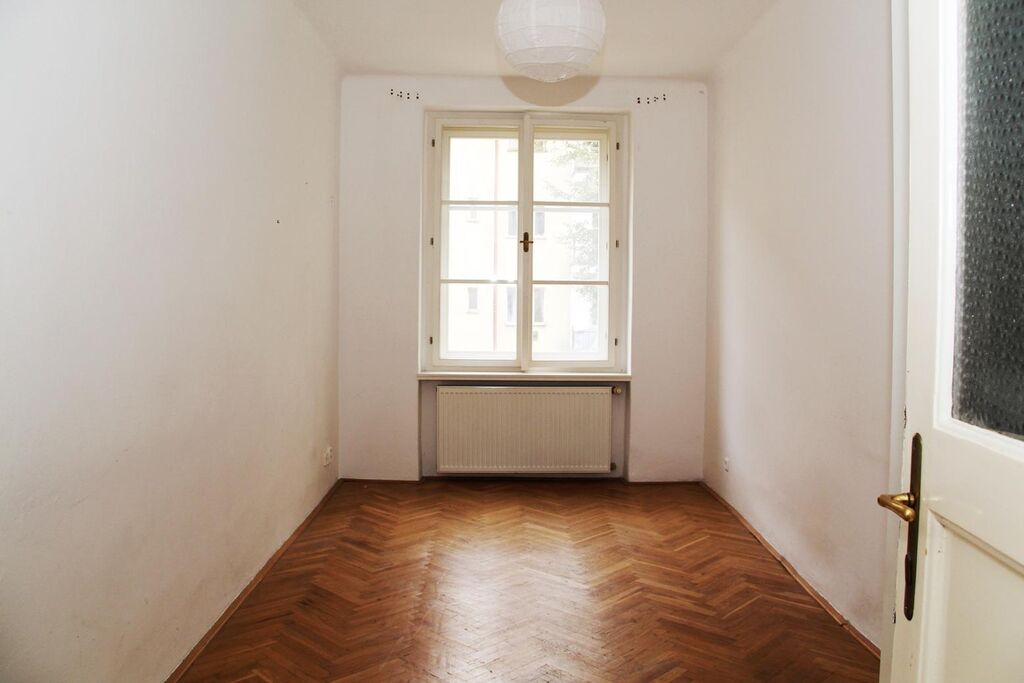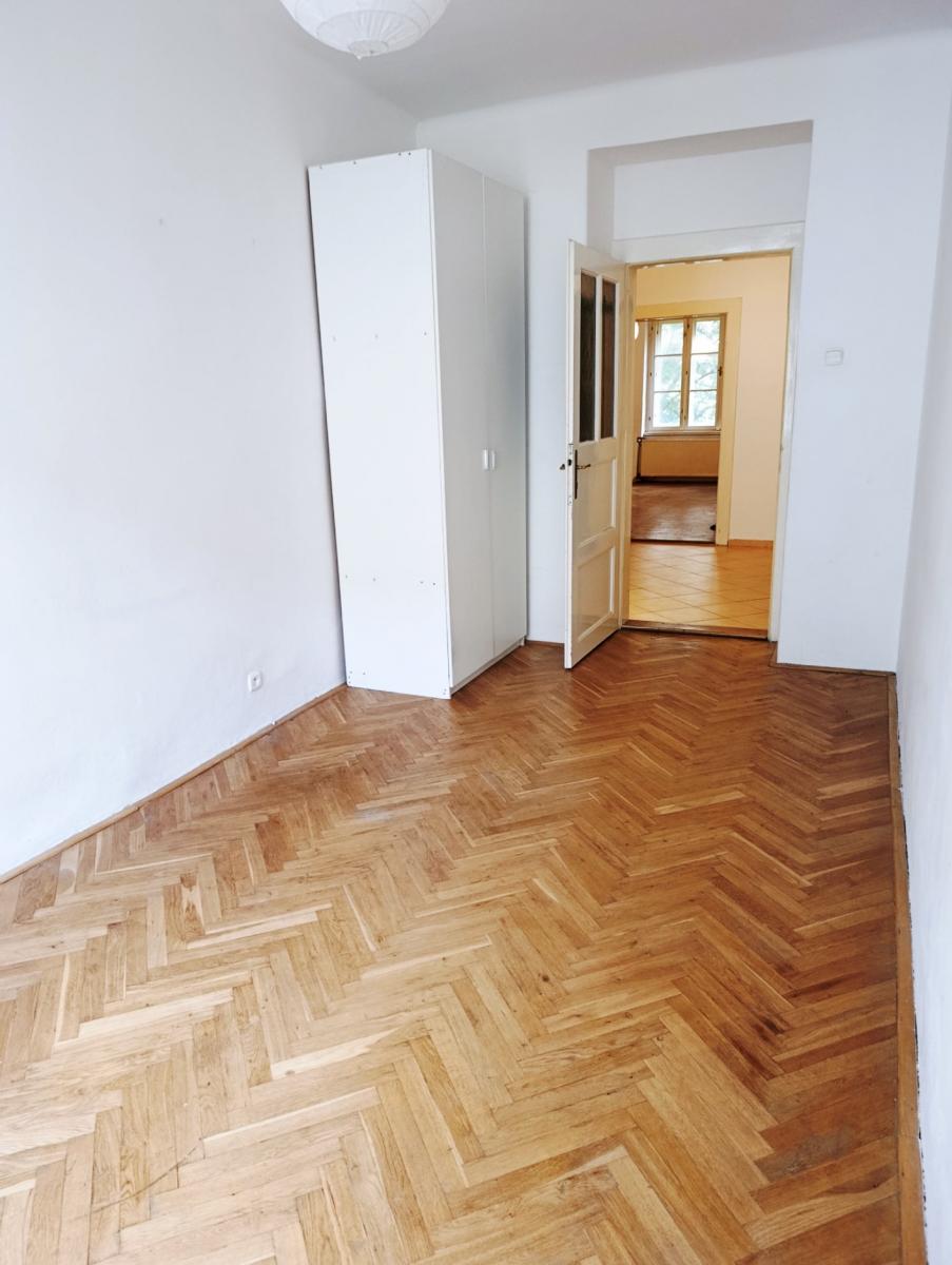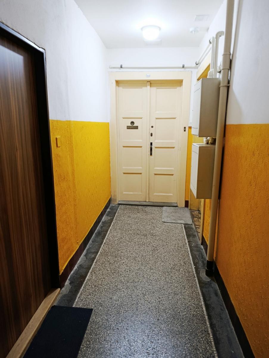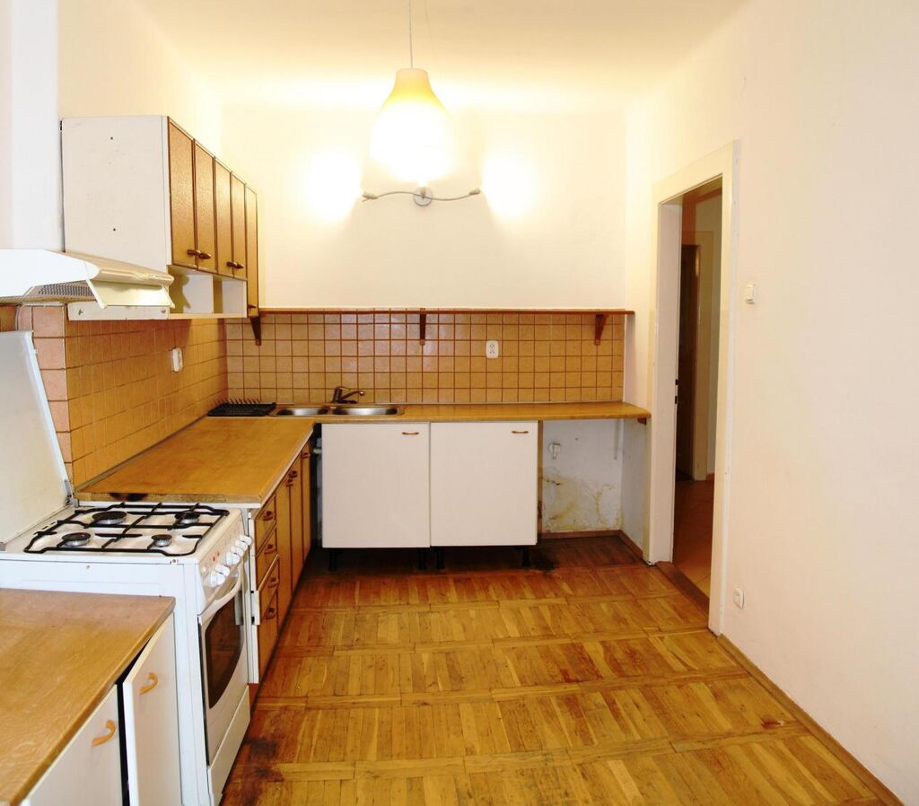 Byt je neadaptovaný, vhodný k rekonstrukci, avšak plně funkční a v případě investiční koupě jej lze s nevelkým nákladem obratem pronajímat. Praktická dispozice bytu zahrnuje předsíň se vstupem do všech ostatních místností bytu, samostatnou kuchyň, obývací pokoj, ložnici, koupelnu společnou s WC a malou komoru. K bytu náleží zděná sklepní kóje v suterénu. Standardem bytu jsou špaletová okna (s orientací na jih do dvora a na sever do klidné ulice), starší kuchyňská linka s kombinovaným sporákem, původní dřevěné dveře do dřevěných zárubní, dřevěné parkety v pokojích a kuchyni a keramická dlažba v předsíni a koupelně, vana, kombi WC, starší plynový kotel (vytápění, ohřev vody).