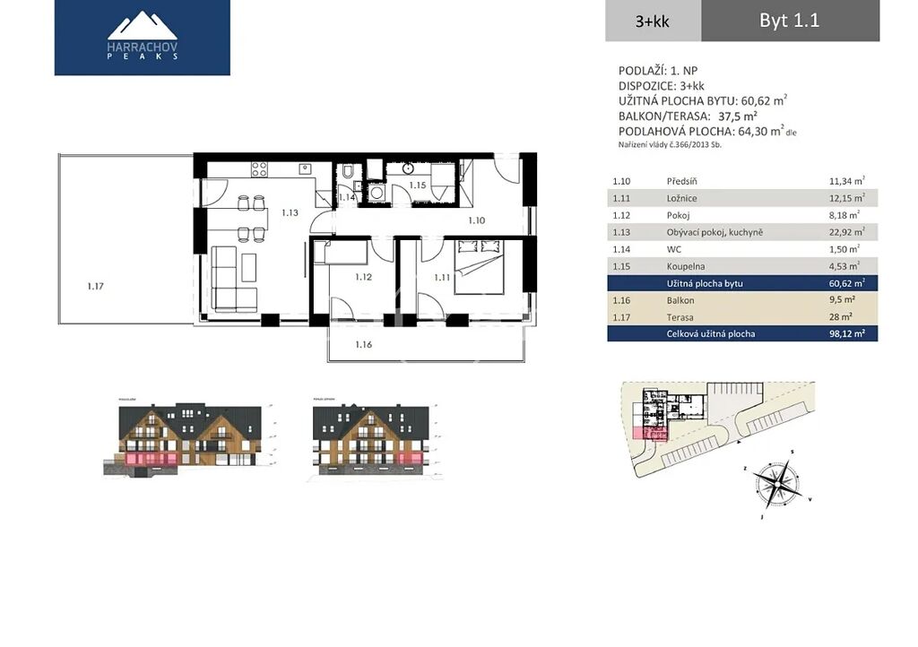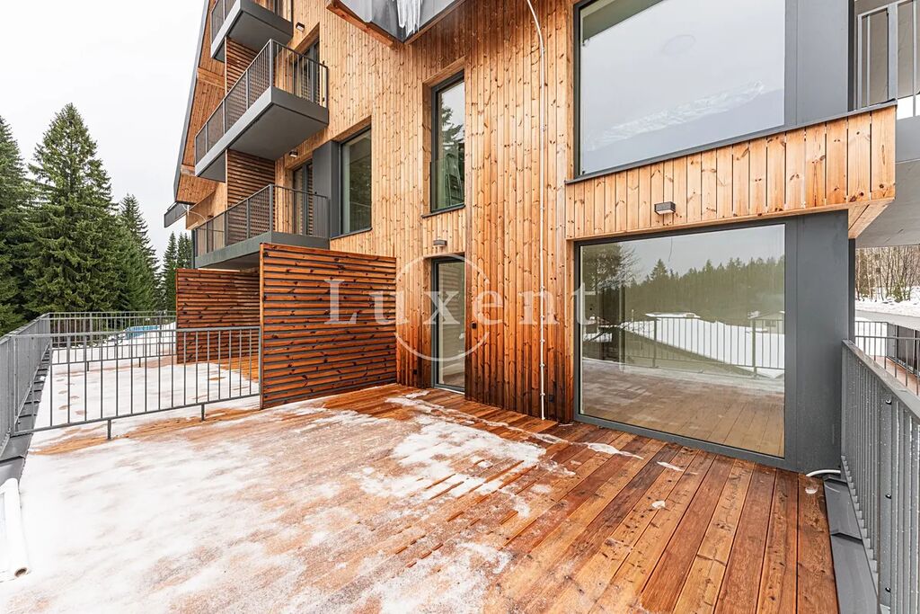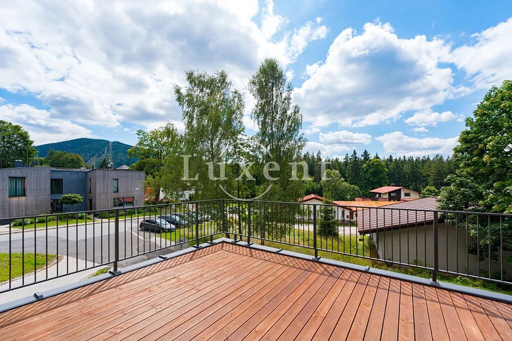 Nabízíme apartmán o dispozici 3+kk v 1.NP luxusního projektu HARRACHOV PEAKS. Apartmán má obytnou plochu 60,62 m2 a celkovou užitnou plochu 98,12 m2 vč. balkonu a terasy (36,78 m2). Projekt je dokončen a zkolaudován a k dispozici je už vzorový byt. V suterénu je majitelům k dispozici wellness se saunou a vířivkou a vybavené fitness.