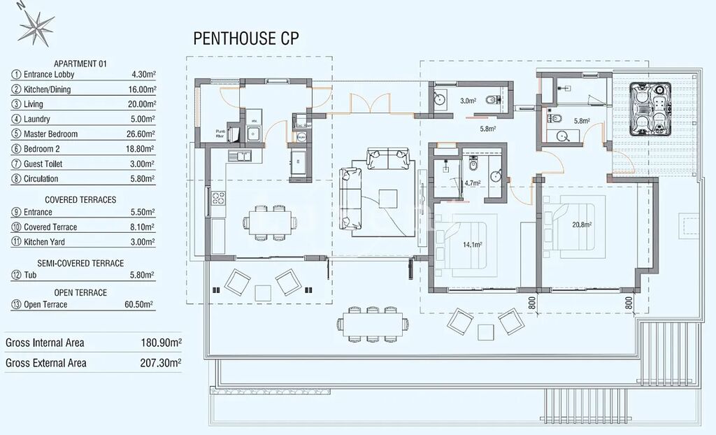 Dispozice bytu o obytné ploše 100 m2 zahrnuje dve ložnice s vlastními koupelnami (27 m2 a 19 m2) a terasami. Prostorný obývací pokoj (20 m2) s kuchyní a jídelnou (16 m2) má velké arkýřové okna, skrze které se dostanete na další terasy (celkem 74 m2), které jsou z části zastřešené. Součástí bytu je také, prádelna (5 m2), toaleta pro hosty (3 m2), kuchyňský dvorek (3 m2), chodba (6 m2) a vstupní hala (4 m2). K tomuto apartmánu také patří dvě parkovací stání.