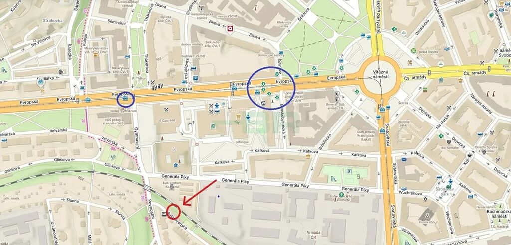 Metro Dejvická 500 m a tramvajová zastávka Thákurova 300 m od garáže.