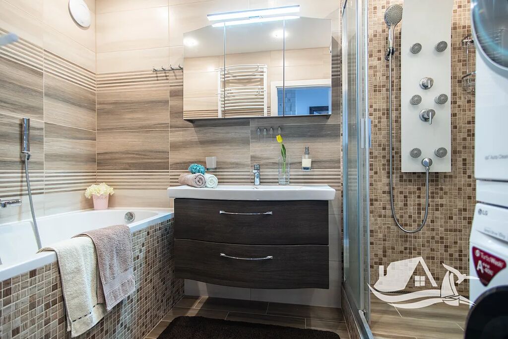 Interiér bytu je navržen s citem pro detail a odolnost materiálů, v kuchyni i koupelně najdete luxusní obklady a sanitu, v obývacím pokoji a ložnicích kvalitní vinylovou podlahu, která si zachovává vzhled dřeva a přitom vydrží každodenní provoz.
