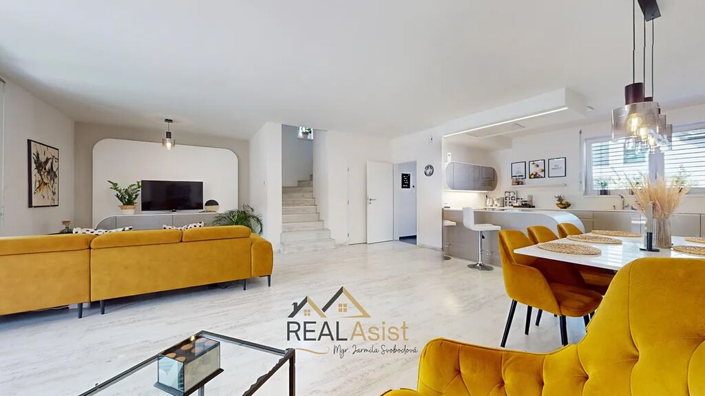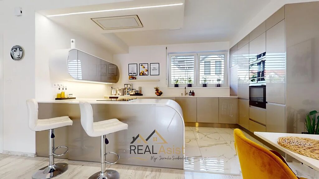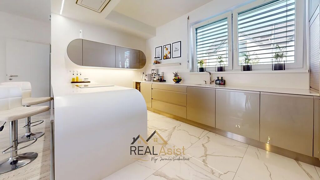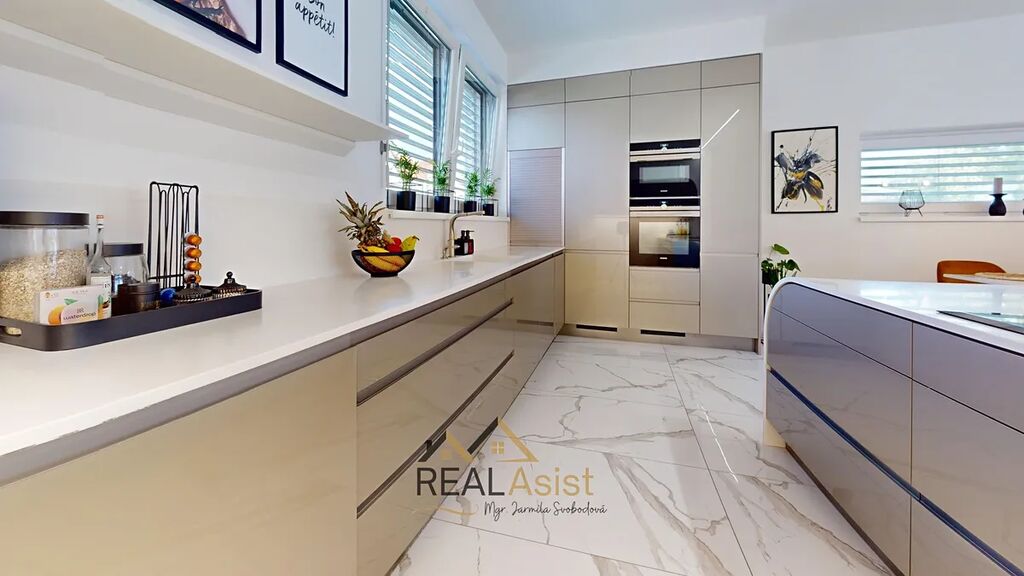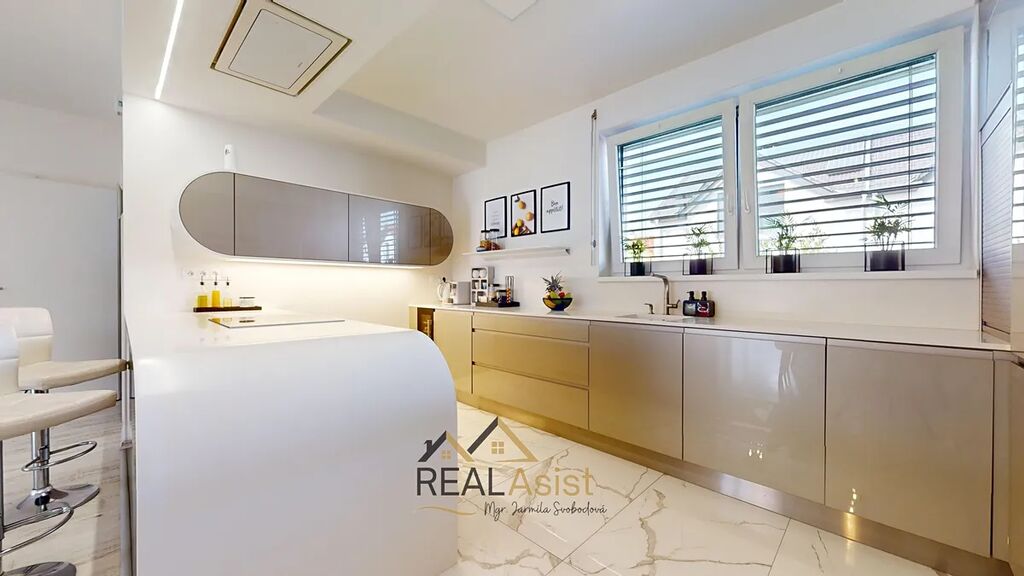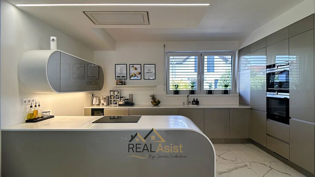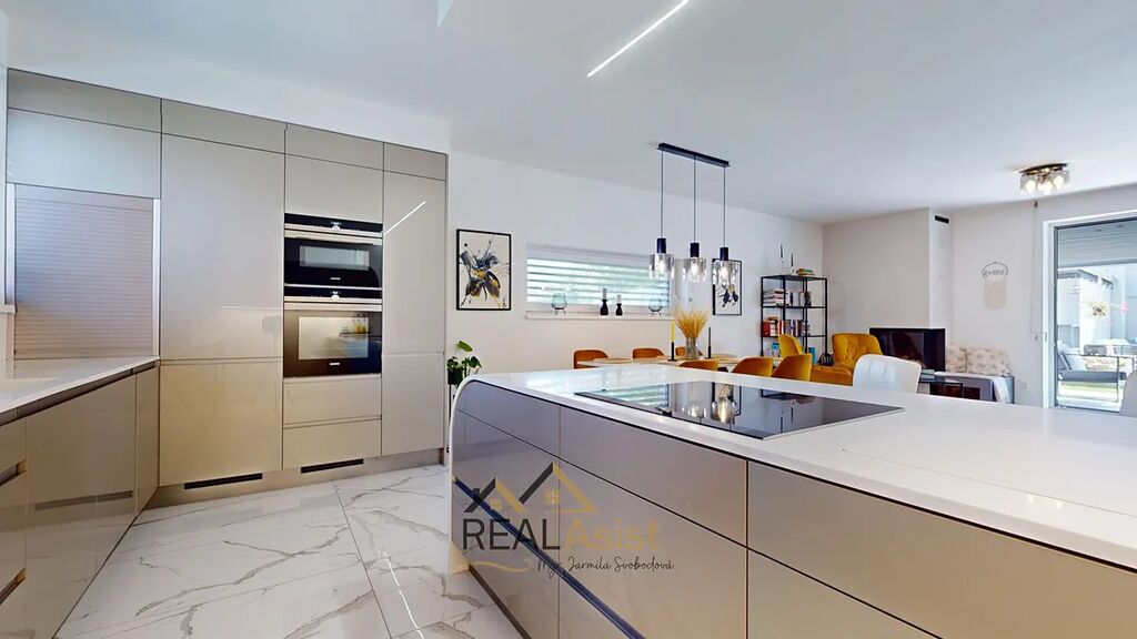 - moderní nadčasová kuchyň s vestavěnými spotřebiči značky Siemens, poskytuje velkorysý pracovní prostor z umělého kamene. Disponuje designovými prvky - oválný kuchyňský ostrůvek, zabudovaná digestoř ve stropním podhledu, podsvícené stropy, aj.