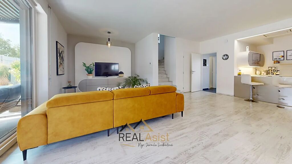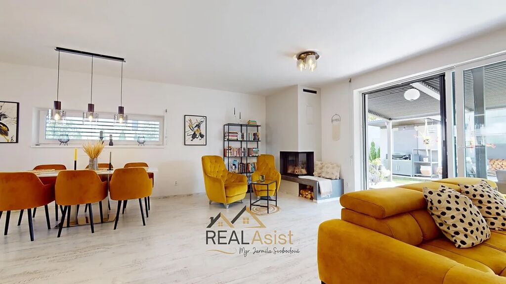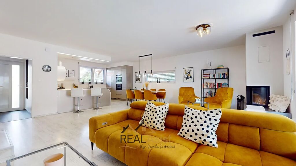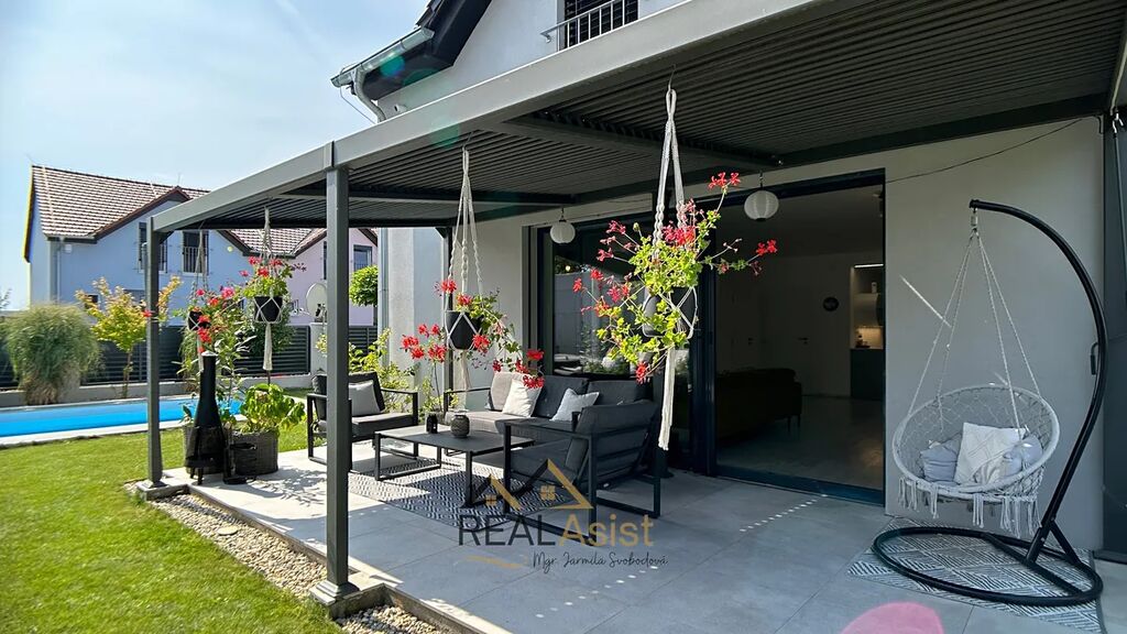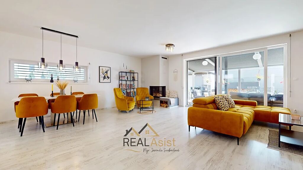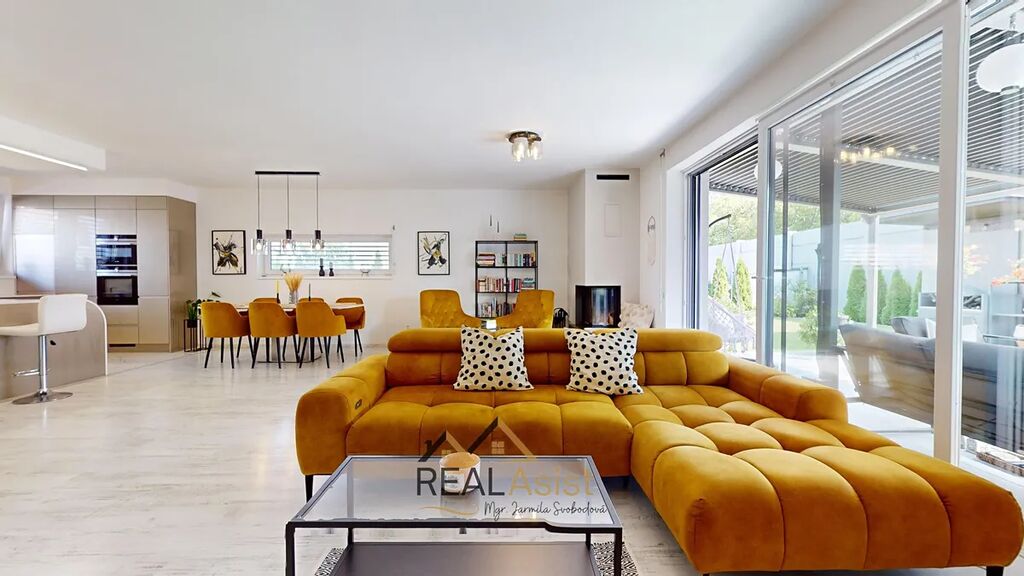 - prostorný obývací pokoj (59 m²) s přímým vstupem na terasu (28 m²) zastíněnou hliníkovou pergolou s posezením.