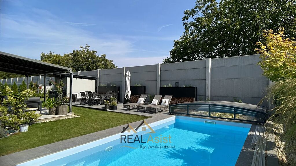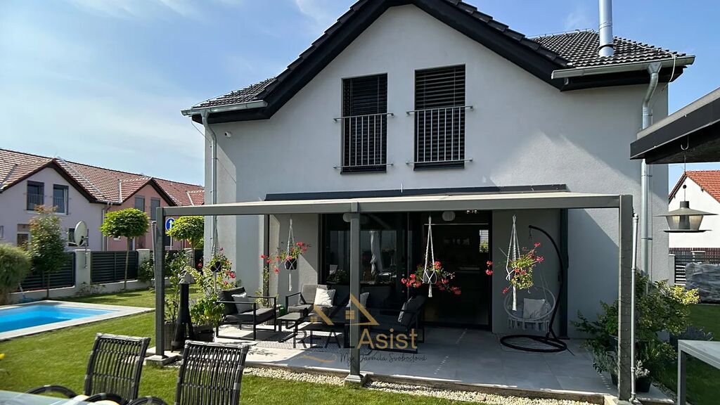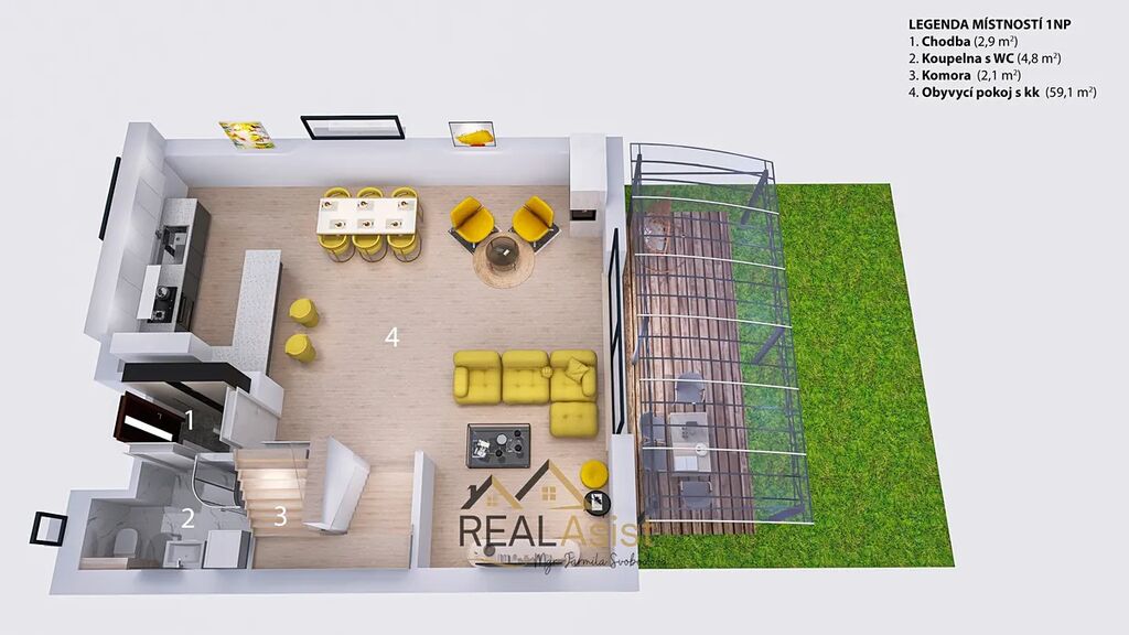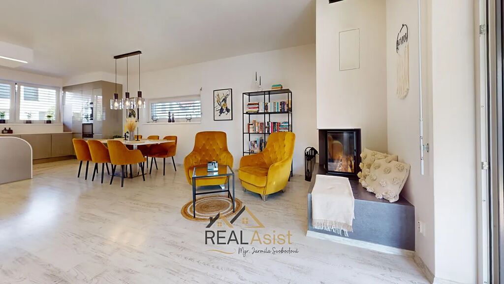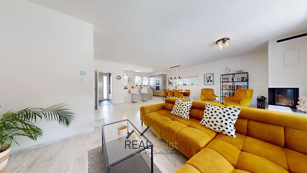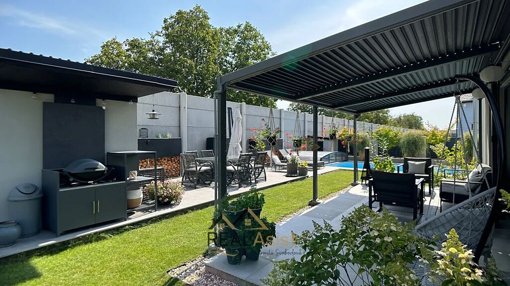 - prostorný obývací pokoj (59 m²) s přímým vstupem na terasu (28 m²) zastíněnou hliníkovou pergolou s posezením.