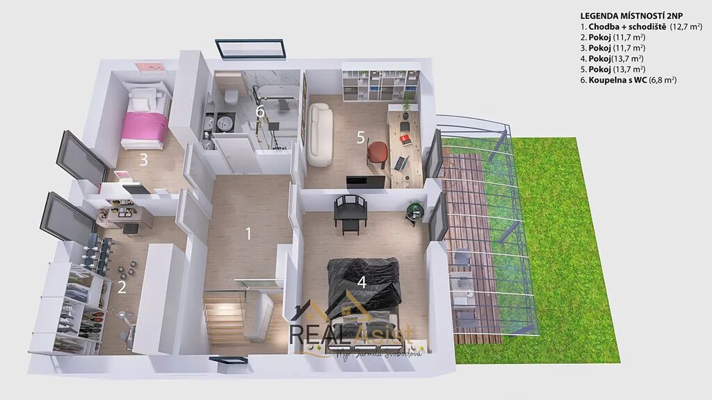 - 3 prostorné pokoje (13,7 m², 11,7 m² a 11,7 m²), vhodné jako dětské pokoje, pracovna, šatna nebo pokoj pro hosty.