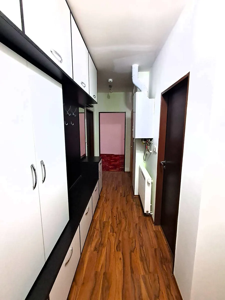 Byt o velikosti 65 m2 se skládá z velkého obývacího pokoje s kuchyňským koutem (myčka, vestavěná trouba, plynový sporák, barový pult, dostatek úložných prostor; lednice může být dodána), ložnice s úložným prostorem a menšího pokoje vhodného jako dětský pokoj či pracovna. V koupelně je velká vana, umyvadlo se skříňkou, otopný žebřík a prostor na pračku. Toaleta je samostatná. Na chodbě se nachází další skříně a úložný prostor. Podlahy jsou plovoucí, v pokoji je koberec. Vytápění je řešeno vlastním plynovým kotlem přes radiátory v místnostech. K dispozici je klimatizace. K bytu náleží zastřešené parkovací místo ve dvoře a praktický kumbál přímo u parkovacího stání.