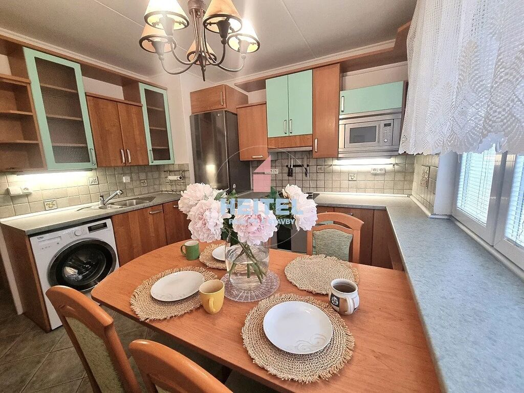 Byt se nachází ve 2. NP s výtahem a je kompletně vybaven kuchyňskou linkou se spotřebiči, kombinovanou lednicí s mrazákem, varnou deskou na plyn, elektrickou troubou, myčkou, odsavačem par, mikrovlnnou troubou, pračkou a nábytkem.