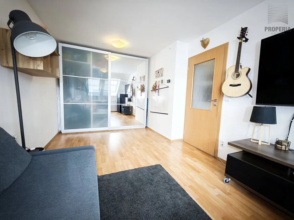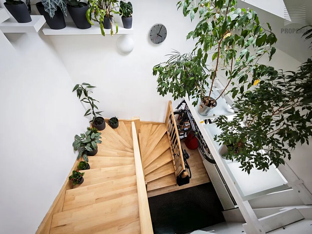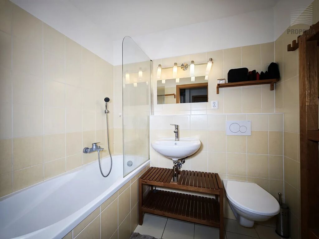 Při vstupu do bytu se ocitnete v předsíni, kde se vlevo nachází praktická komůrka vhodná jako šatna či úložná prostor. Z předsíně vedou schody do horní části bytu, kde se nachází koupelna s vanou, obývací pokoj s prostornou skříní, plně vybavenou kuchyní a jídelním koutem a chodbou, kde v nice je situován vlastní kotel s ohřevem vody, pračka a myčka. Dispozice dále nabízí ložnici s klidným zázemím pro odpočinek. Veškeré vybavení zde v případě přání kupujícího zůstává.
