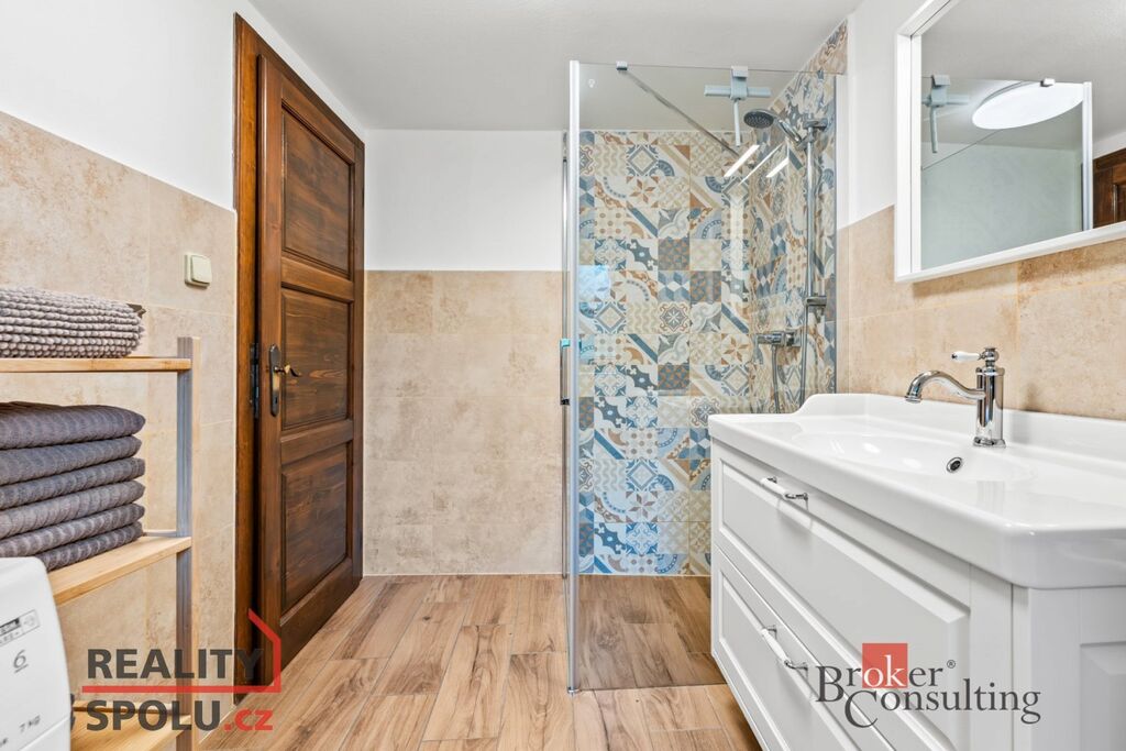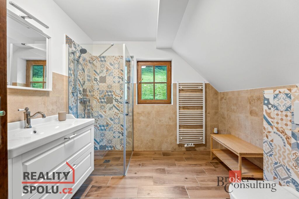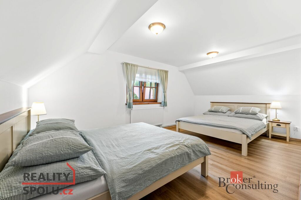 Chalupa o celkové ploše 183,2 m² prošla rozsáhlou rekonstrukcí a je plně vybavena pro komfortní bydlení. V přízemí se nachází prostorný obývací pokoj s kachlovými kamny, pohodlnou sedací soupravou a televizí, kuchyně s moderními spotřebiči včetně myčky, trouby s indukční deskou a kávovaru, dále je tu ložnice, koupelna s odděleným WC a komora. Další ložnice a dva pokoje se nachází v prvním patře, kde je také koupelna vybavená sprchovým koutem a WC, což zajišťuje dostatek prostoru pro rodinu či hosty.