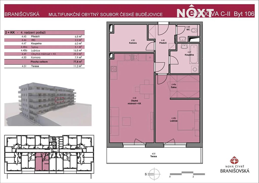 Ložnice o velikosti 16,8 m² má oddělený prostor na šatnu a nabízí přímý vstup na terasu. Hlavní obytná místnost s kuchyňským koutem o ploše 29,2 m² působí vzdušně a prostorně a rovněž disponuje vstupem na terasu. Komora o velikosti 7,9 m² rozšiřuje úložné možnosti a dodává bytu mimořádnou praktičnost. Terasa o velikosti 11,2 m² je skutečnou dominantou bytu – poskytuje příjemný výhled na zeleň vnitrobloku i na okolní krajinu a stává se dalším obytným prostorem, kde si můžete užít klidné večery či posezení s přáteli.