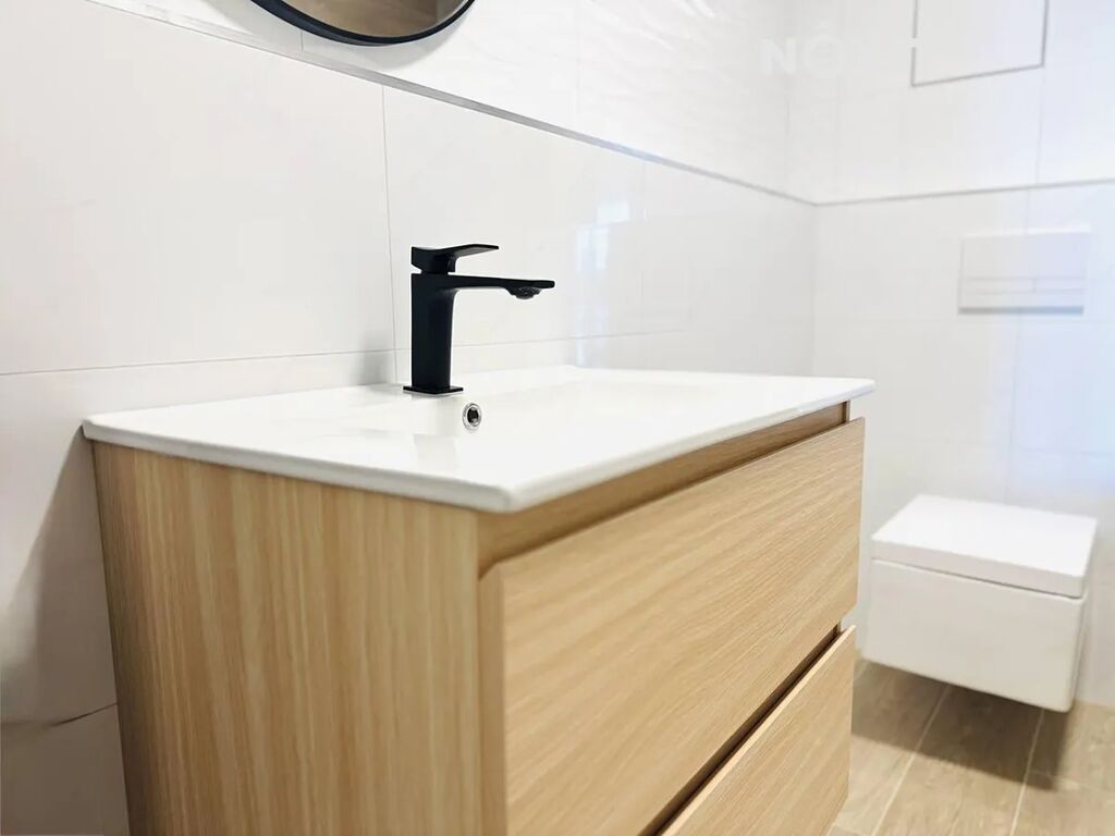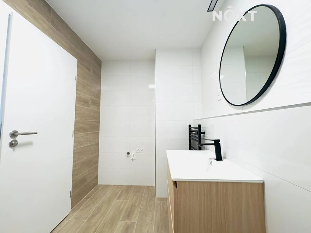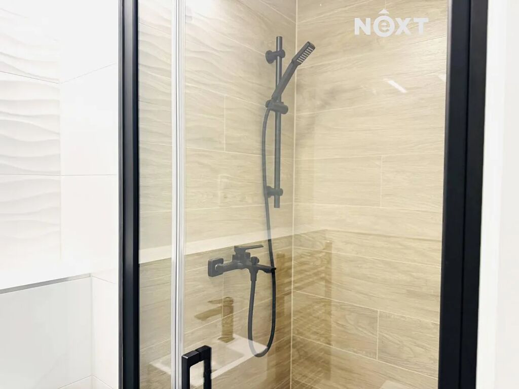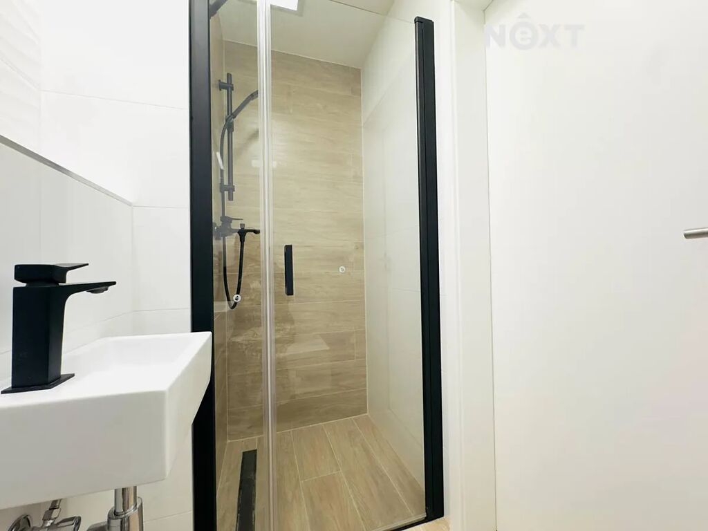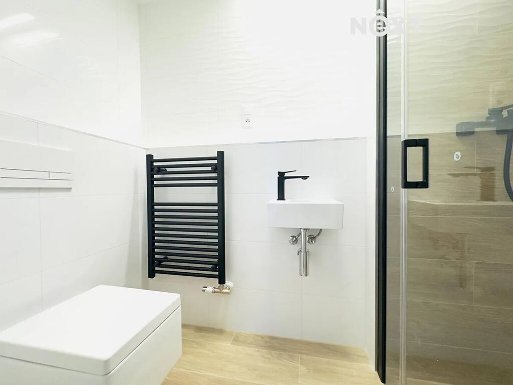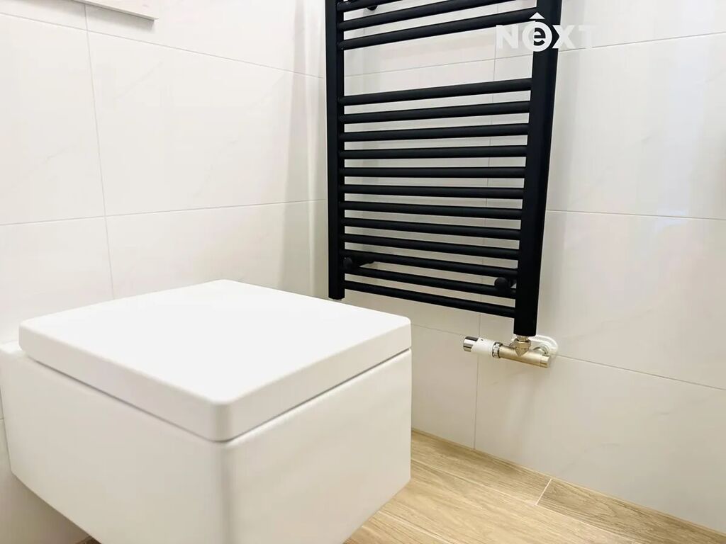 Po vstupu vás přivítá elegantní předsíň o velikosti 10,6 m², která poskytuje dostatek místa pro dvě velké vestavěné skříně. Díky tomu získáte komfortní prostor pro uložení věcí, aniž by narušoval vzdušnost bytu. Z předsíně vstoupíte do samostatného WC se sprchovým koutem o velikosti 2,5 m², praktického zejména pro hosty. Další místností je hlavní koupelna o velikosti 5,4 m², vybavená vanou, umyvadlem a toaletou – její moderní provedení v kombinaci dřeva a bílé keramiky působí svěže a luxusně.