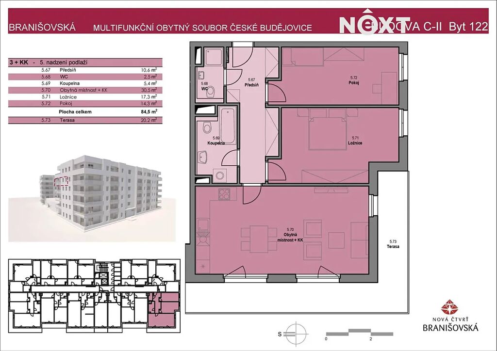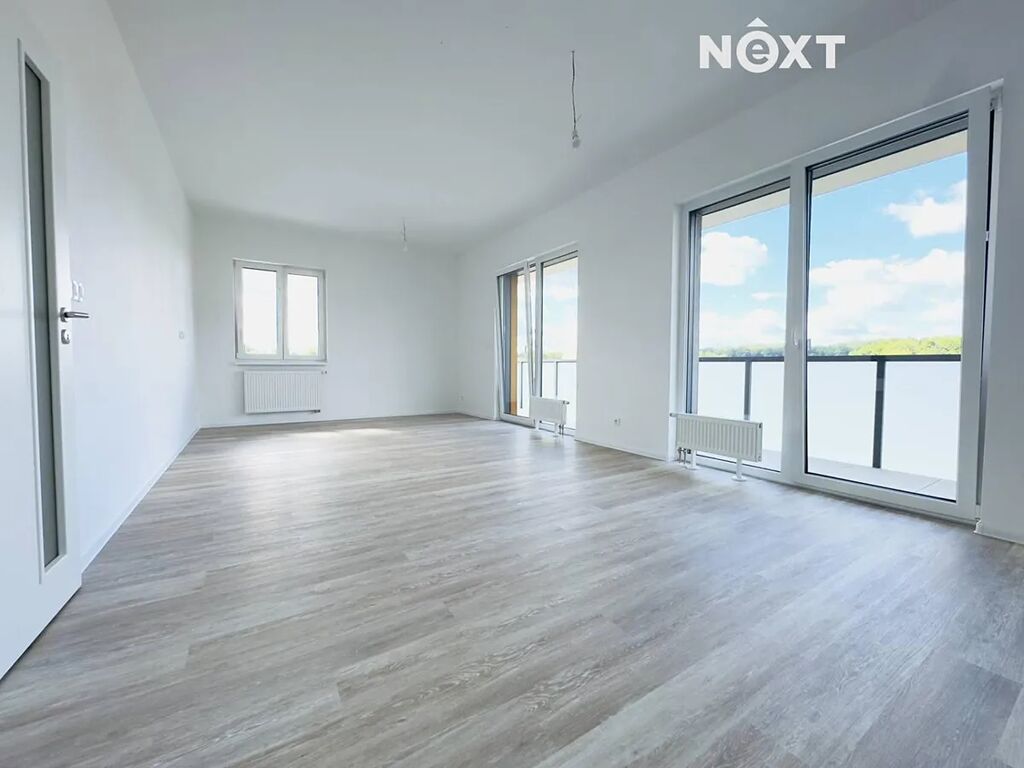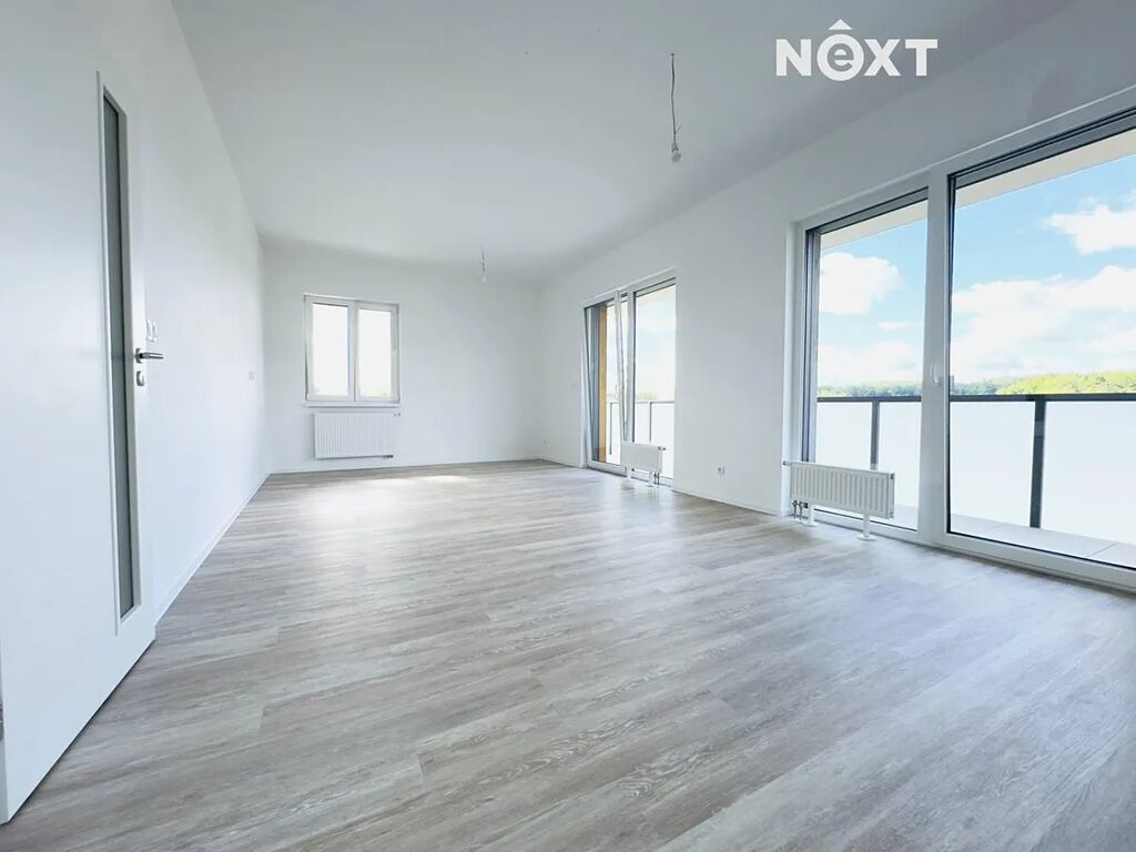 Byt disponuje dvěma ložnicemi – hlavní ložnice o velikosti 17,3 m² poskytuje nejen klidné zázemí pro odpočinek, ale i možnost umístění vestavné skříně po celé délce stěny. Druhý pokoj o velikosti 14,3 m² je ideální jako dětský pokoj, pracovna nebo pokoj pro hosty a rovněž nabízí dostatek prostoru pro šatní skříň či knihovnu. Dominantou je velkorysá obytná místnost s kuchyňským koutem o ploše 30,5 m², která díky rohové poloze a velkým francouzským oknům působí naprosto jedinečně. Z obytného prostoru vstupujete na terasu o velikosti 20,2 m², kde si vychutnáte ranní kávu i večerní západy slunce s ničím nerušeným výhledem na okolní krajinu.