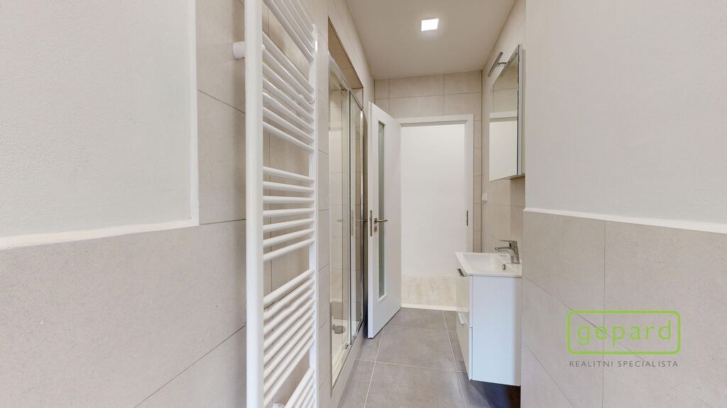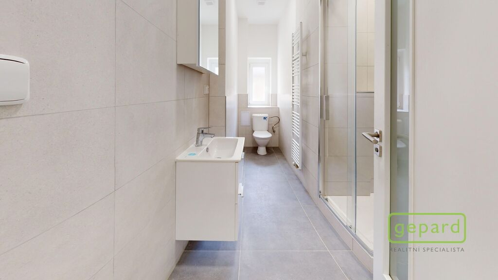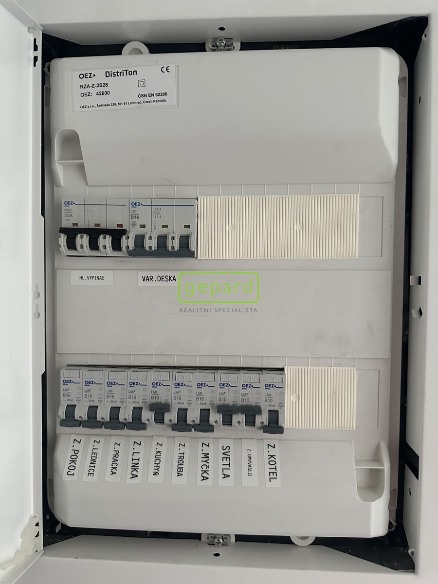 Podlaha tvořena z vinylových desek. Vnitřní omítka zhotovena vápenno-cementová, štuková. Dlažby a obklady keramické v celém rozsahu koupelny. Vytápění řešeno plynovým kondenzačním kotlem Geminox, který je odkouřen do komínového průduchu s přisáváním. Případně možnost využití přípravy na elektrokotel (HDO v rozvaděči). Internet přes optický kabel. Fond oprav činí pouze 2055,- Kč měsíčně.