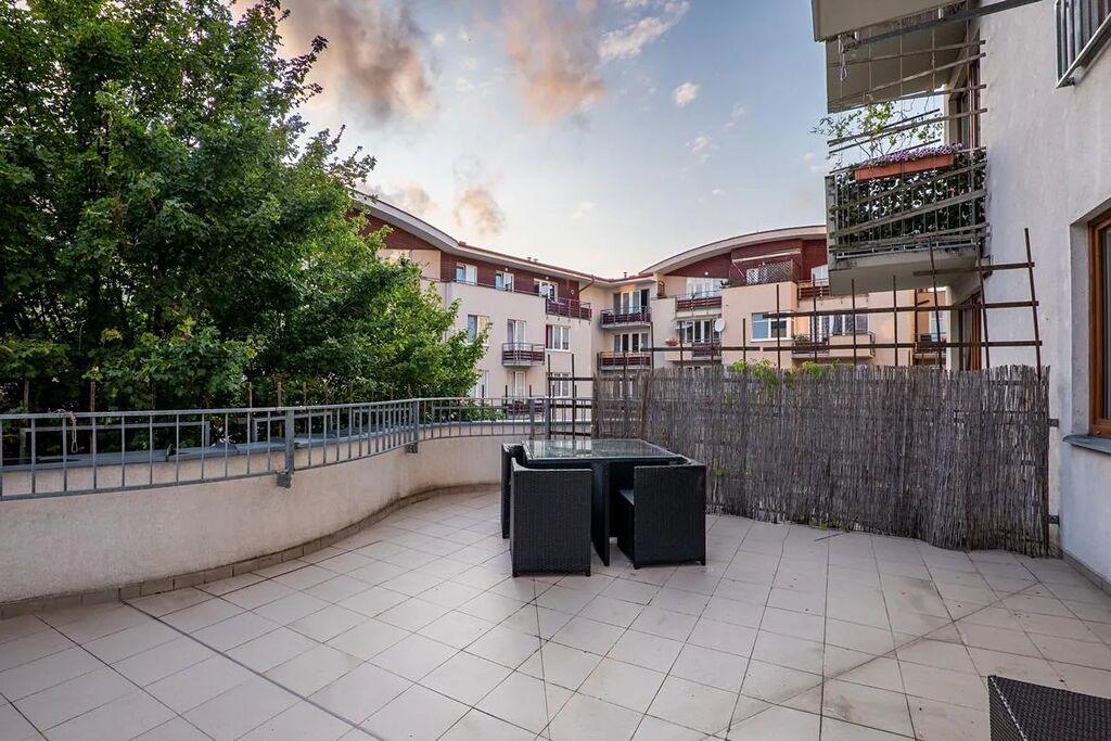 Samotný byt je situován v přízemí cihlového domu s úrovni oken více než 1.patra. Byt je dispozičně řešen jako 1+kk. ale lze jej rozdělit na byt 2+kk. Celková plocha bytu činí 43,9 m2 včetně venkovní komory 2,2 m2. K bytu náleží terasa o ploše 37,3 m2, která vyzývá k příjemnému posezení, slunění, grilování nebo také k pěstování vlastních rajčátek. Byt je velmi zdařile a nápaditě designově proveden. Je vybaven kuch. linkou se zabudovanými spotřebiči, vestavěnou skříní v předsíni. V pokoji se nachází biokrb. Veškerá okna směřují na terasu a jsou orientována na západní stranu, v oknech jsou instalovány žaluzie. Vytápění bytu a ohřev teplé vody zajišťuje plynový kondenzační kotel.