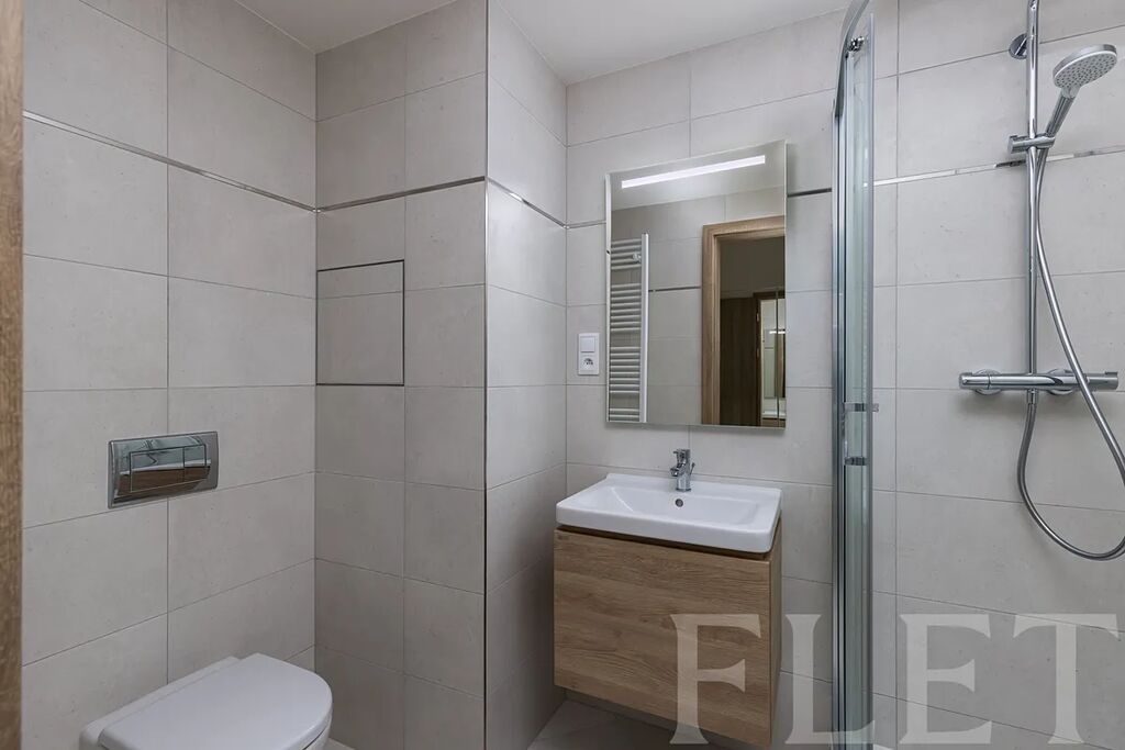 Součástí koupelny se sprchovým koutem a toaletou je také pračka. Byt je vybaven moderním systémem větrání s rekuperací tepla. V předsíni je připravena zrcadlová skříň, která zajišťuje dostatek úložného prostoru pro vaše osobní věci. Součástí pronájmu je také sklepní kóje a parkovací stání přímo v domě.