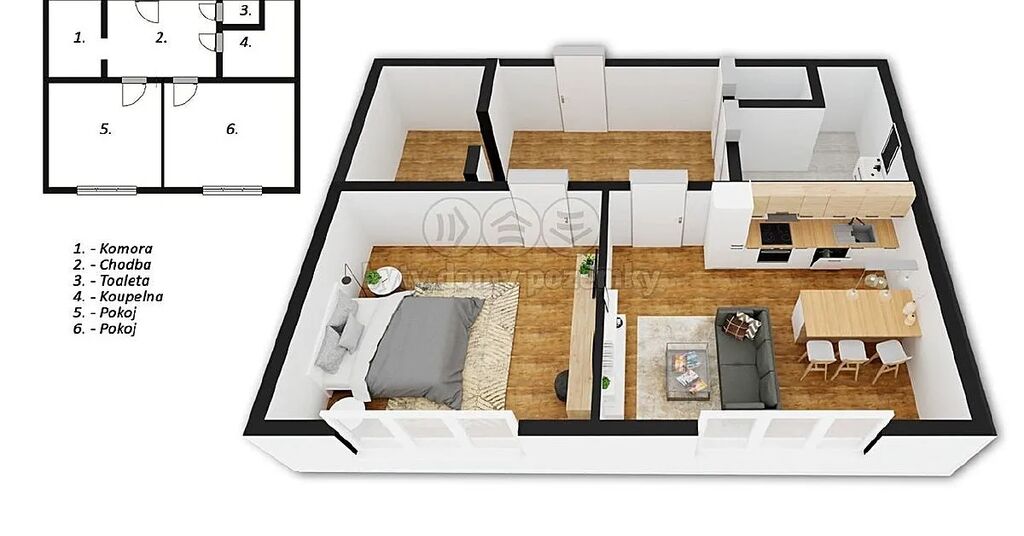 Byt disponuje dvěma prostornými pokoji, které díky velkým oknům přímo září denním světlem. V jednom z nich je umístěna praktická kuchyňská linka připravená na Vaše kulinářské výtvory. Velkou výhodou je prostorná vstupní chodba, kde lze vytvořit šatnu, pracovnu či komoru dle Vašich potřeb.