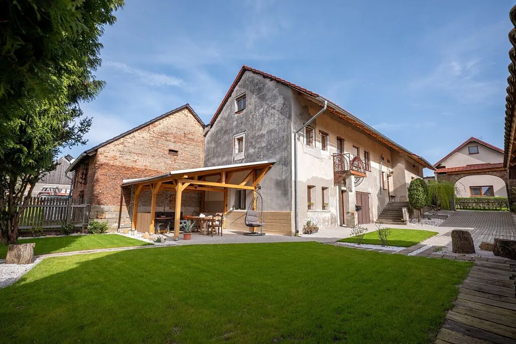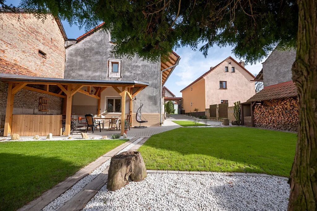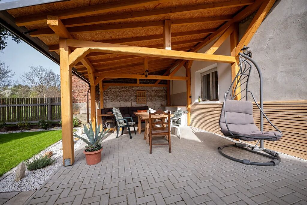 Venkovní prostor je ztělesněním kouzla venkova s novou zámkovou dlažbou, pergolou a venkovní kuchyní, kde si můžete užívat snídaně na čerstvém vzduchu nebo večerní grilování s přáteli. K dispozici je také nový dřevník s kapacitou cca 19 kubíků dřeva. Statika původní pískovcové opěrné zdi byla pečlivě upravena, došlo k přidělání dvou nových opěrných zdí, které zvětšují rovinatou plochu zahrady pro Vaše pohodlí a zábavu.