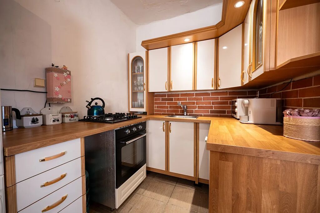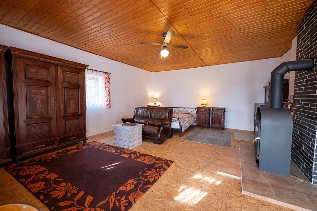 Interiér domu je dokonale sladěn s chalupářským životním stylem, přičemž kuchyň je vybavena vším, co potřebujete pro vaření, tzn. sporák, vestavěná myčka, vestavěná lednice, průtokový ohřívač vody k dřezu. Nová krbová kamna v obývacím pokoji přidávají na útulnosti během chladných večerů. Koupelna je vybavena vanou, umyvadlem a má přípojku pro pračku. Velkou výhodou je samostatné WC.