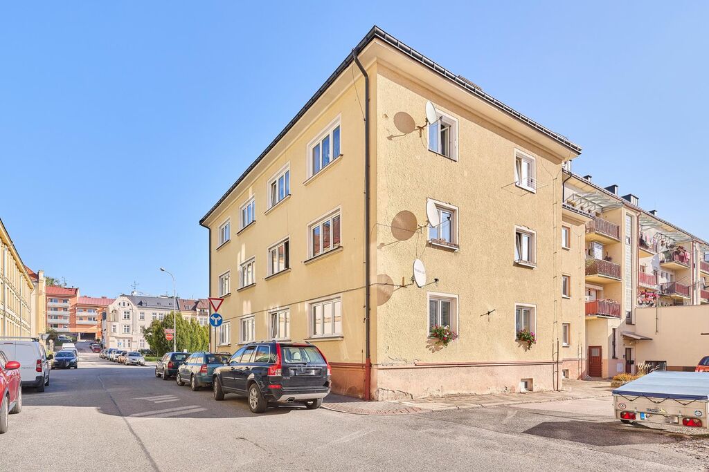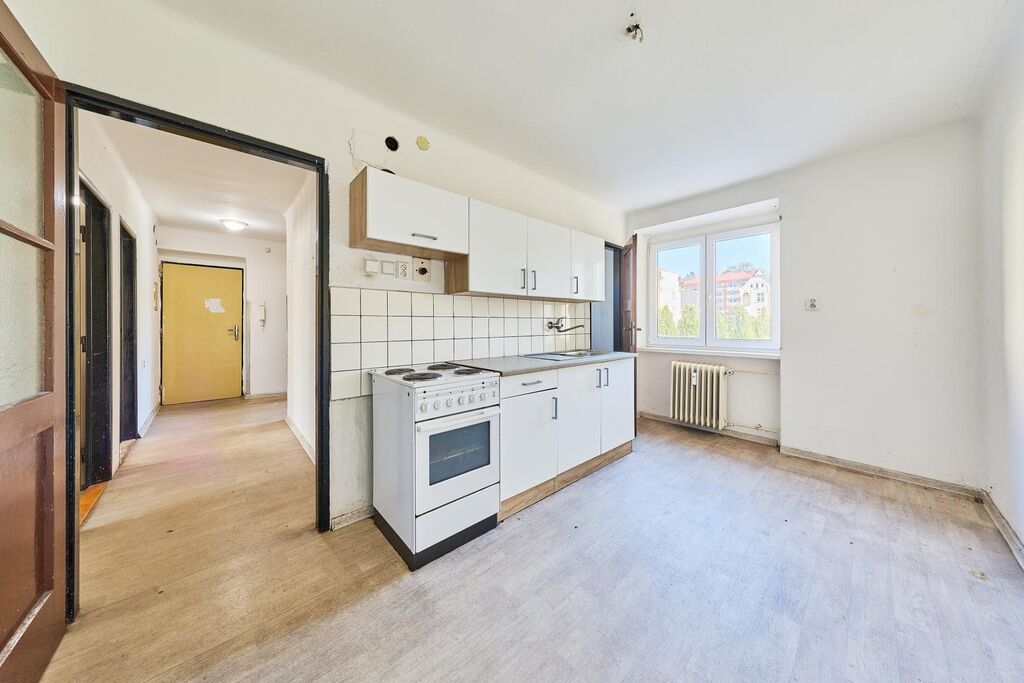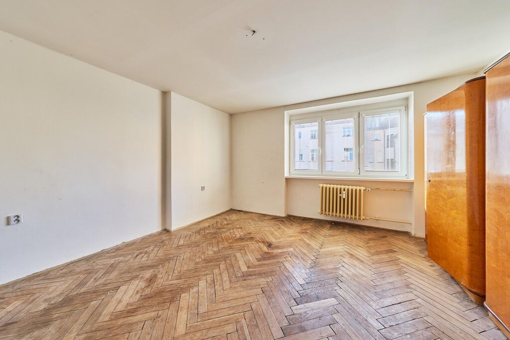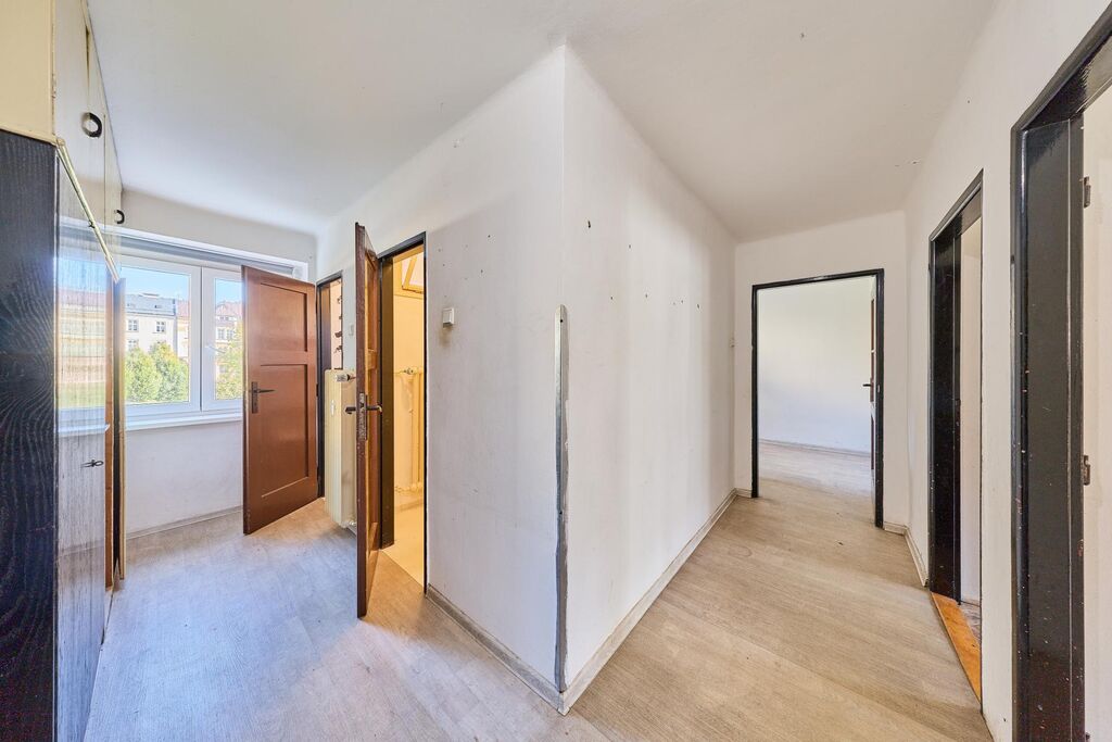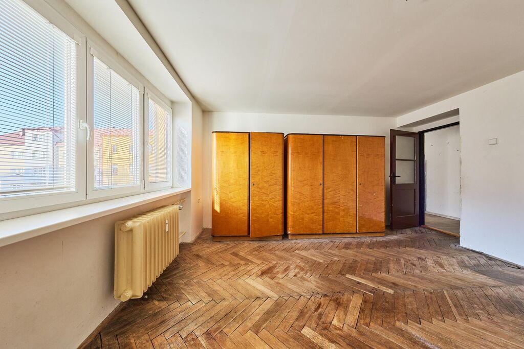 Dispozice bytu: prostorná vstupní chodba, kuchyně + spíž, obývací pokoj, ložnice, koupelna s vanou, samostatné WC. Okna bytu jsou orientována na sever (směr na Jiráskovo náměstí) a na jih. K bytu náleží kóje v suterénu domu. Byt má osazena nová plastová okna, jinak je v původním stavu, vhodný k rekonstrukci, avšak i nyní je pronajmutelný.